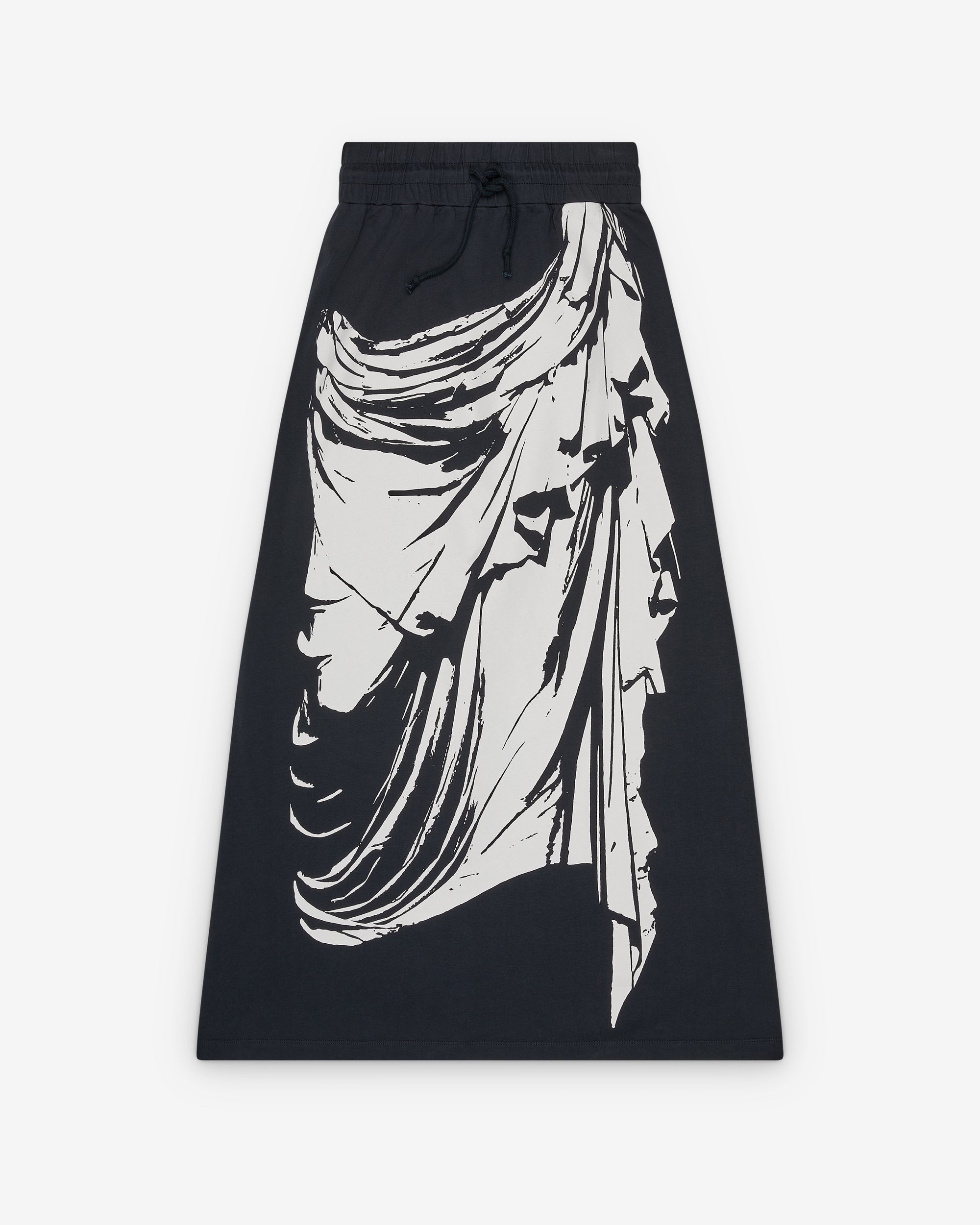Elasticated waistband with drawcordFull-lengthPrinted graphicRear central vent