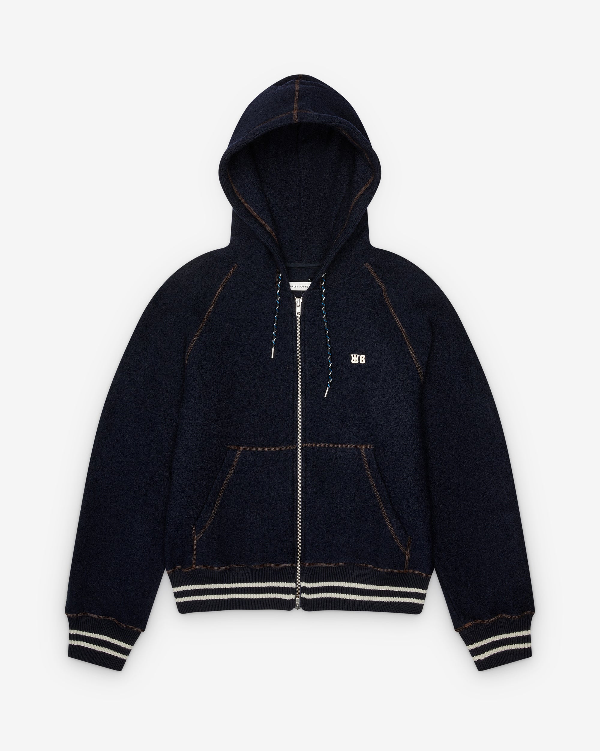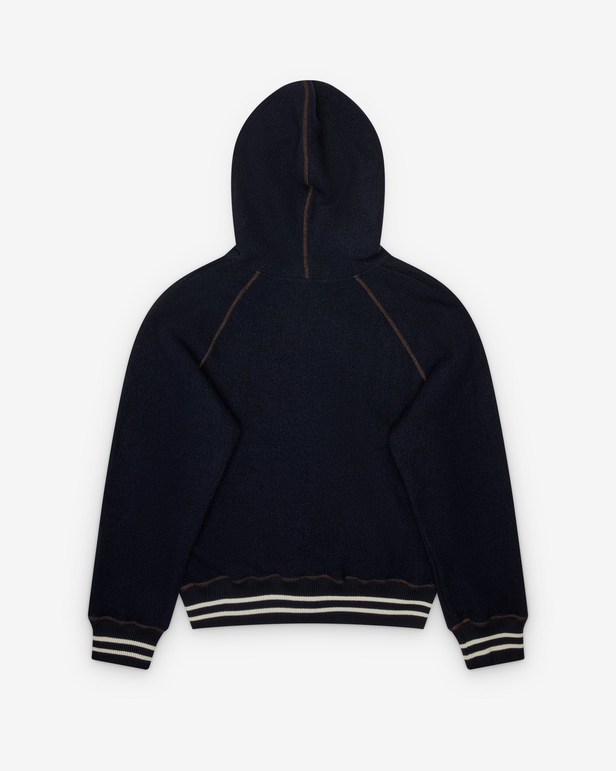Full zip hoodieNavy woolRust brown top stitchingContrast striped ribsJacquard drawstring100% Virgin WoolMade in Portugal