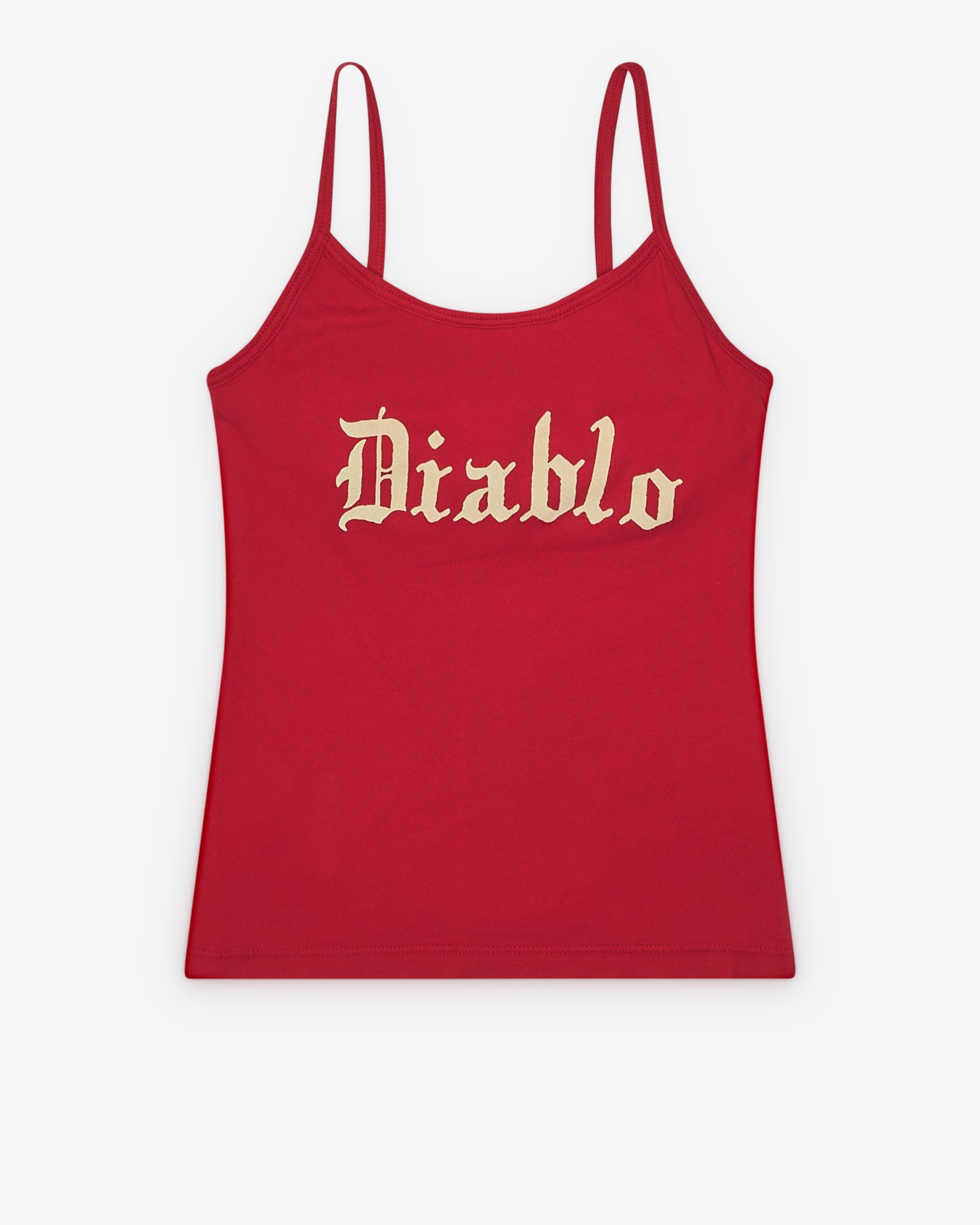 Diablo screenprintSpaghetti strapsForm-fitting silhouetteOpen neckline100% CottonMade in USA