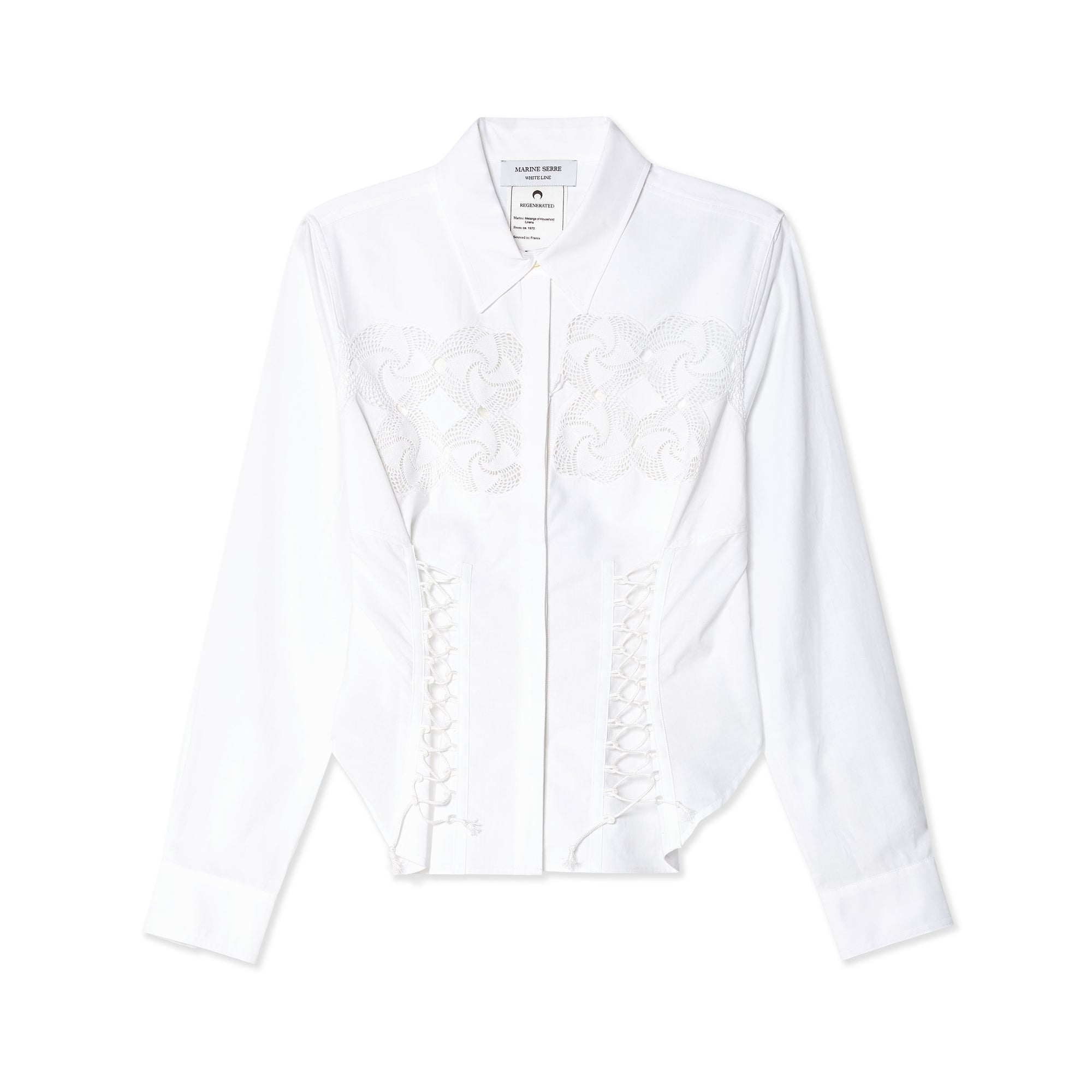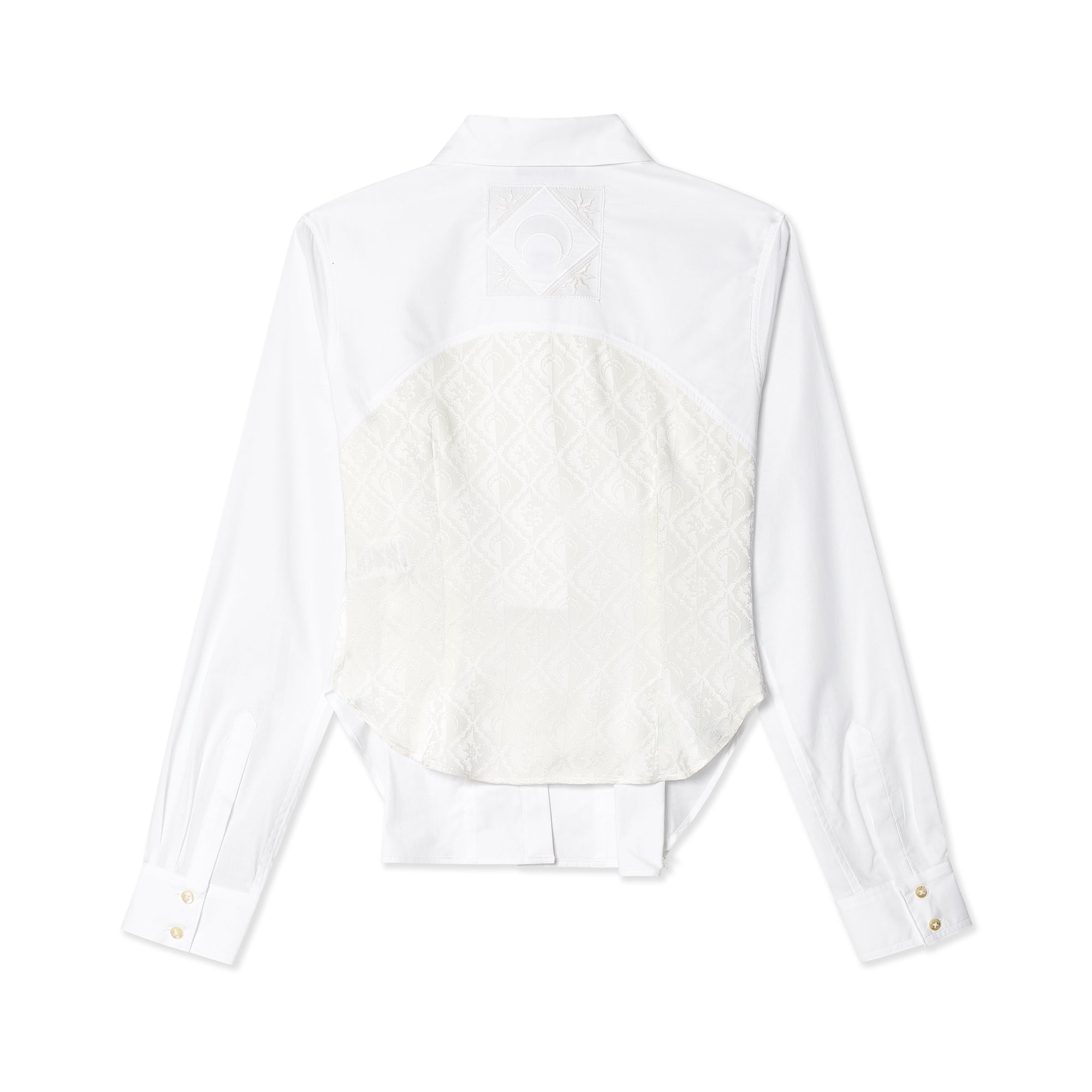 Straight-point collarFront hook and eye fasteningRear lace-up fasteningLong sleevesButtoned cuffsFront lace-up detailLong sleevesButtoned cuffsCurved hem