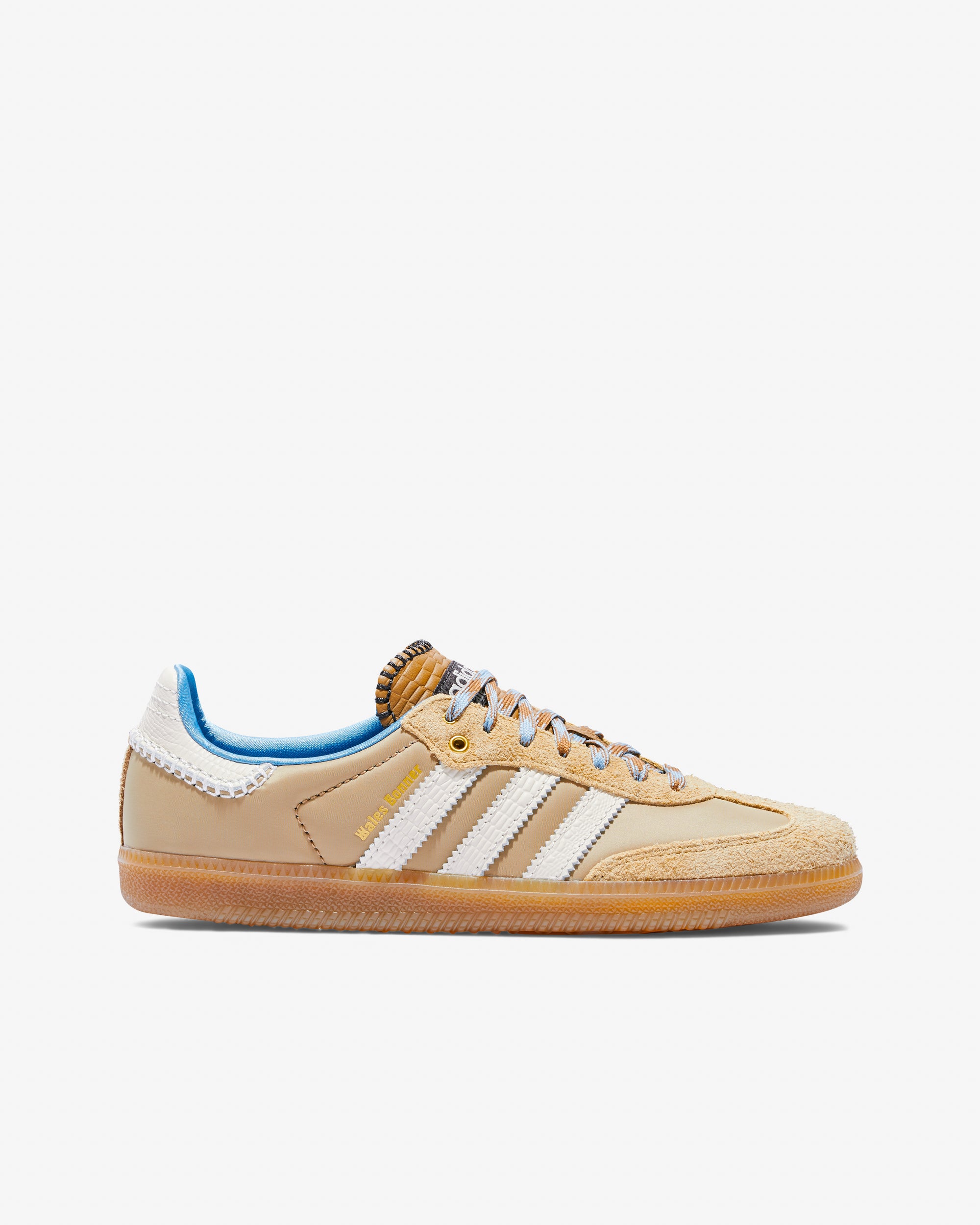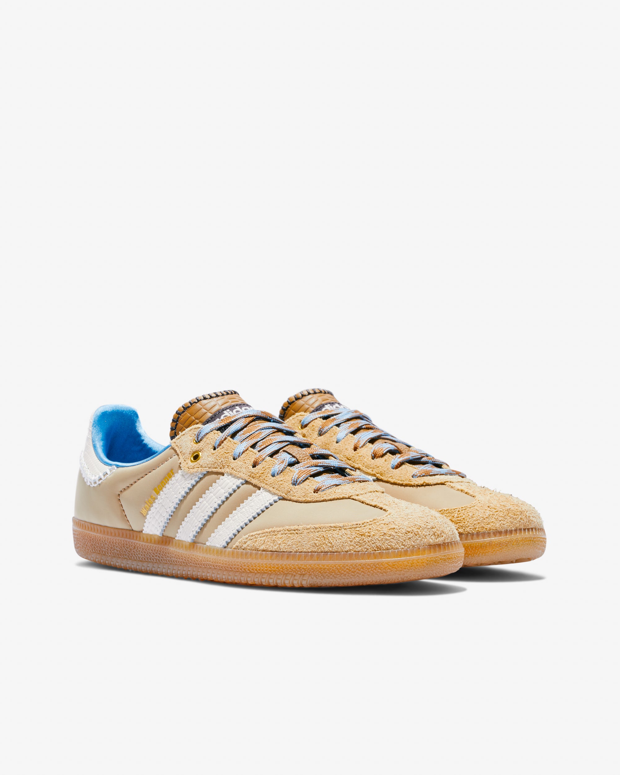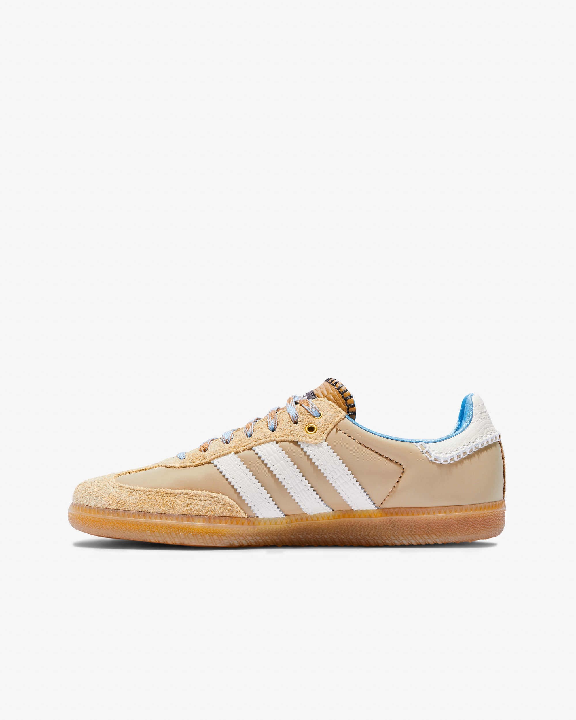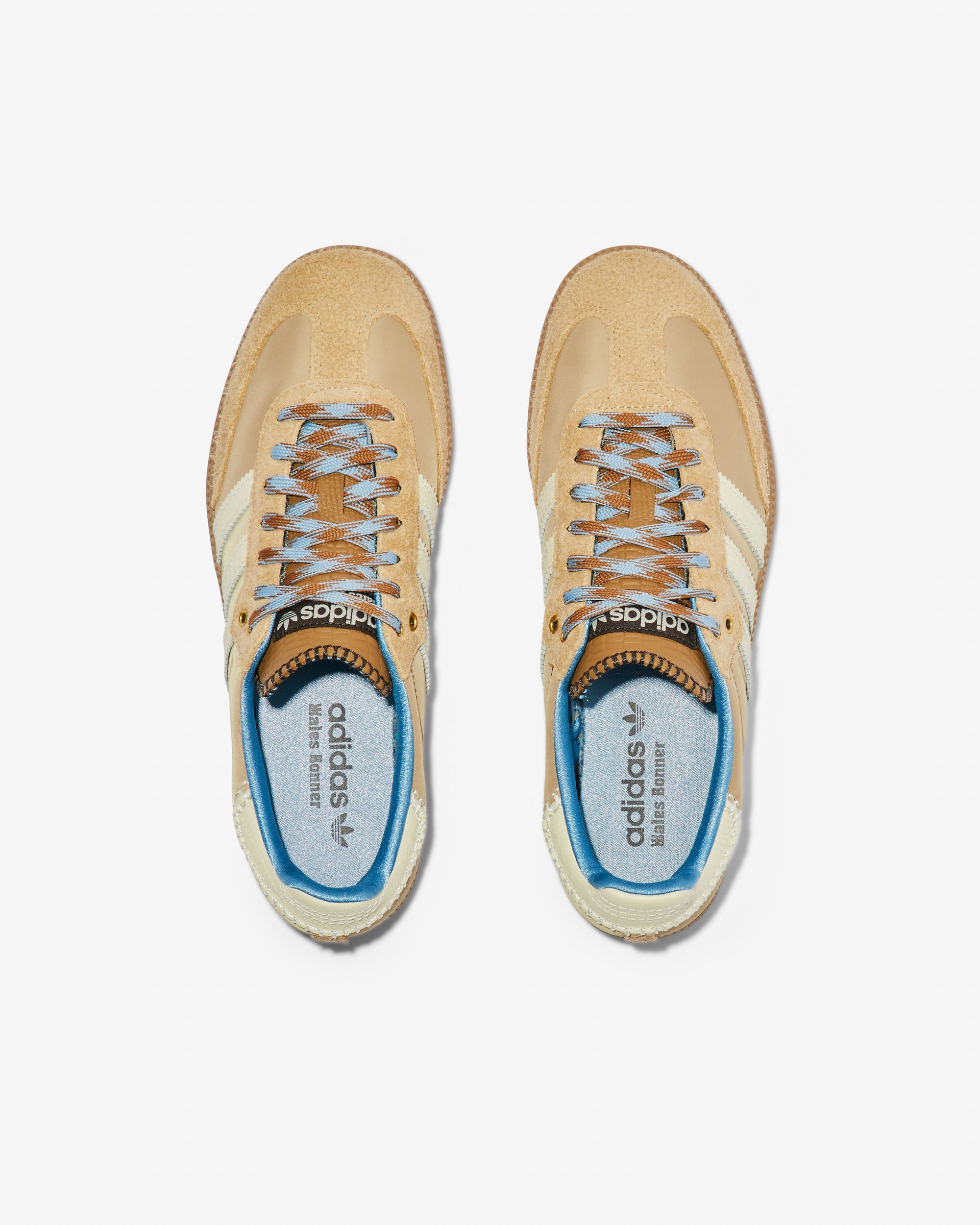 Lace closureLeather upperCo branding at tongueFoil Wales Bonner logo at sideRubber soleSuede overlaysSatin lining