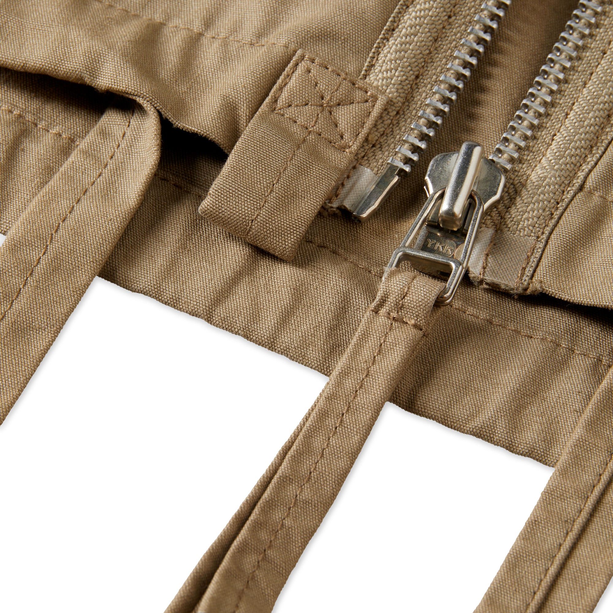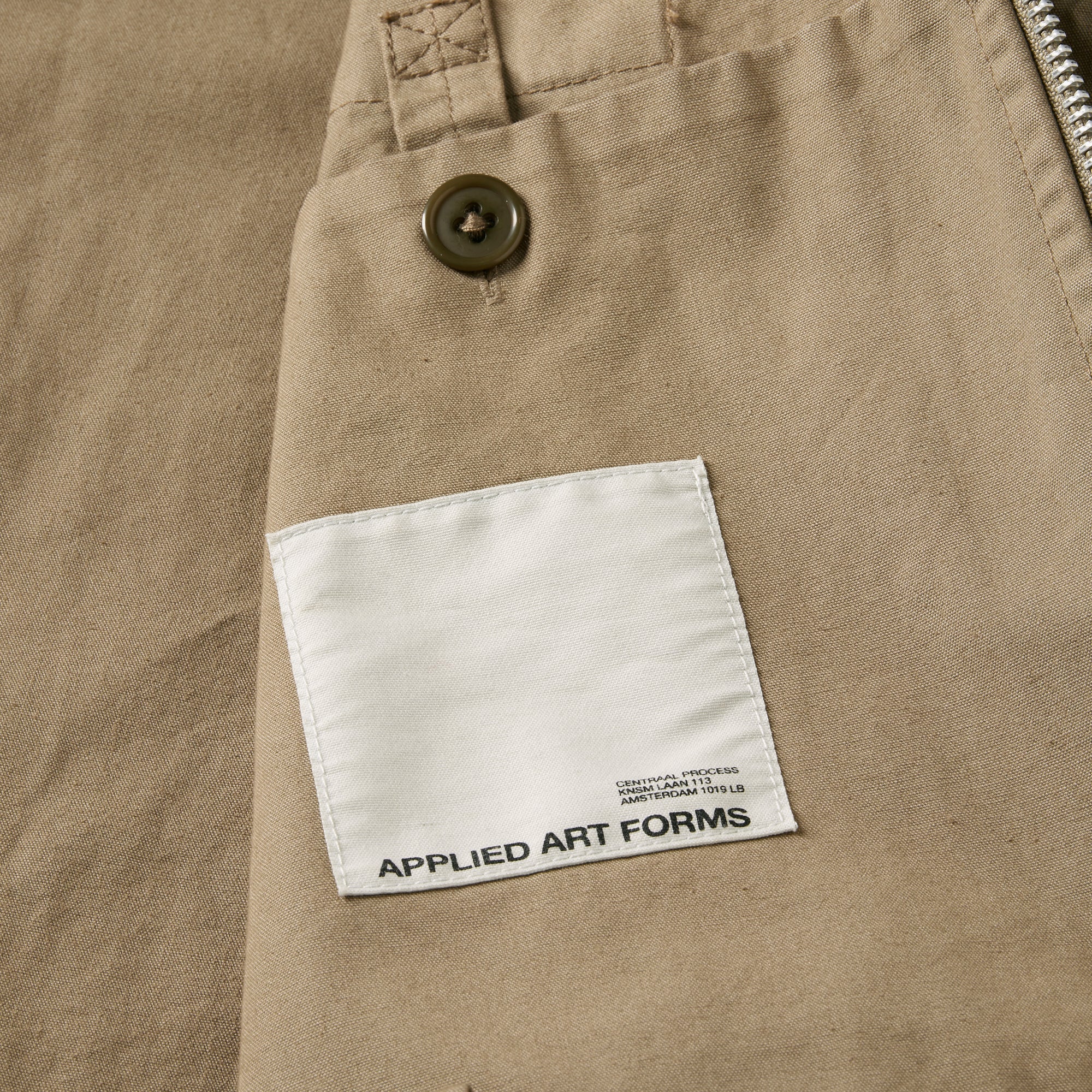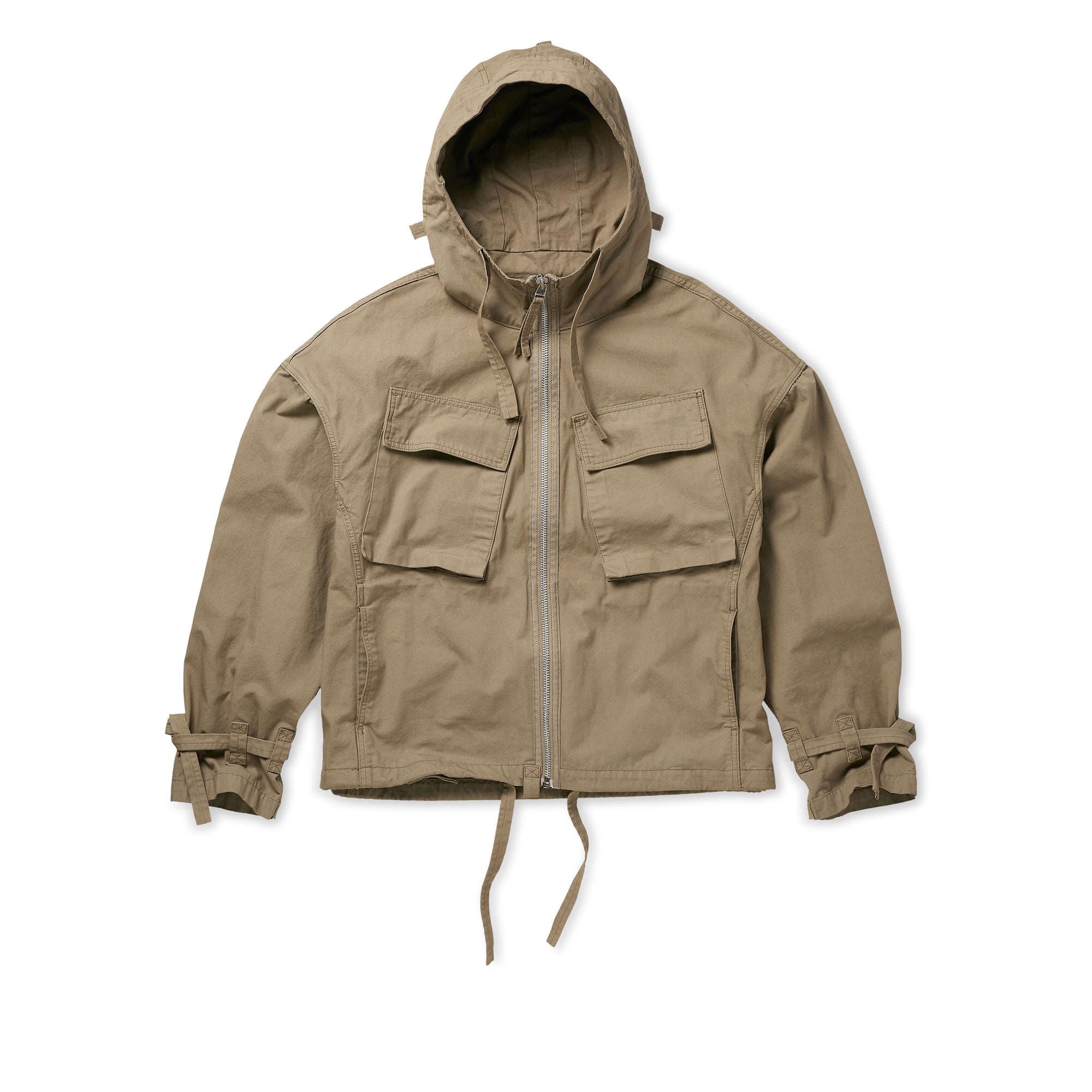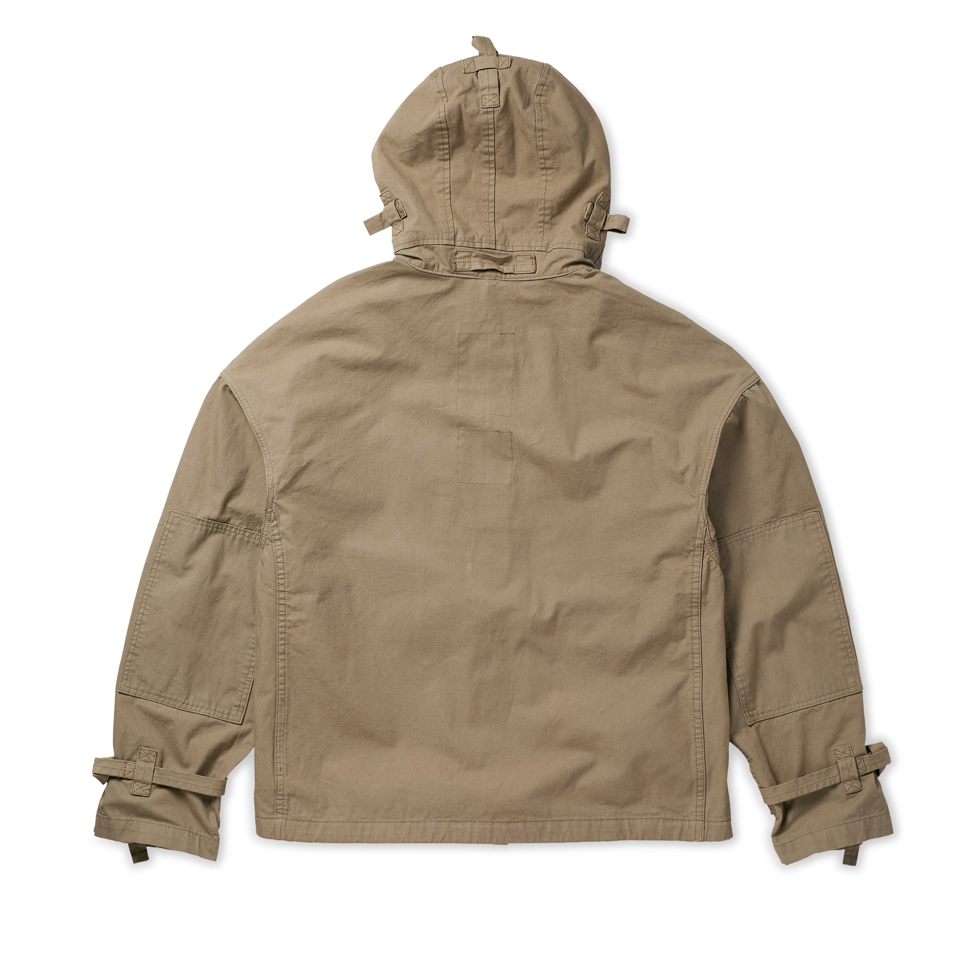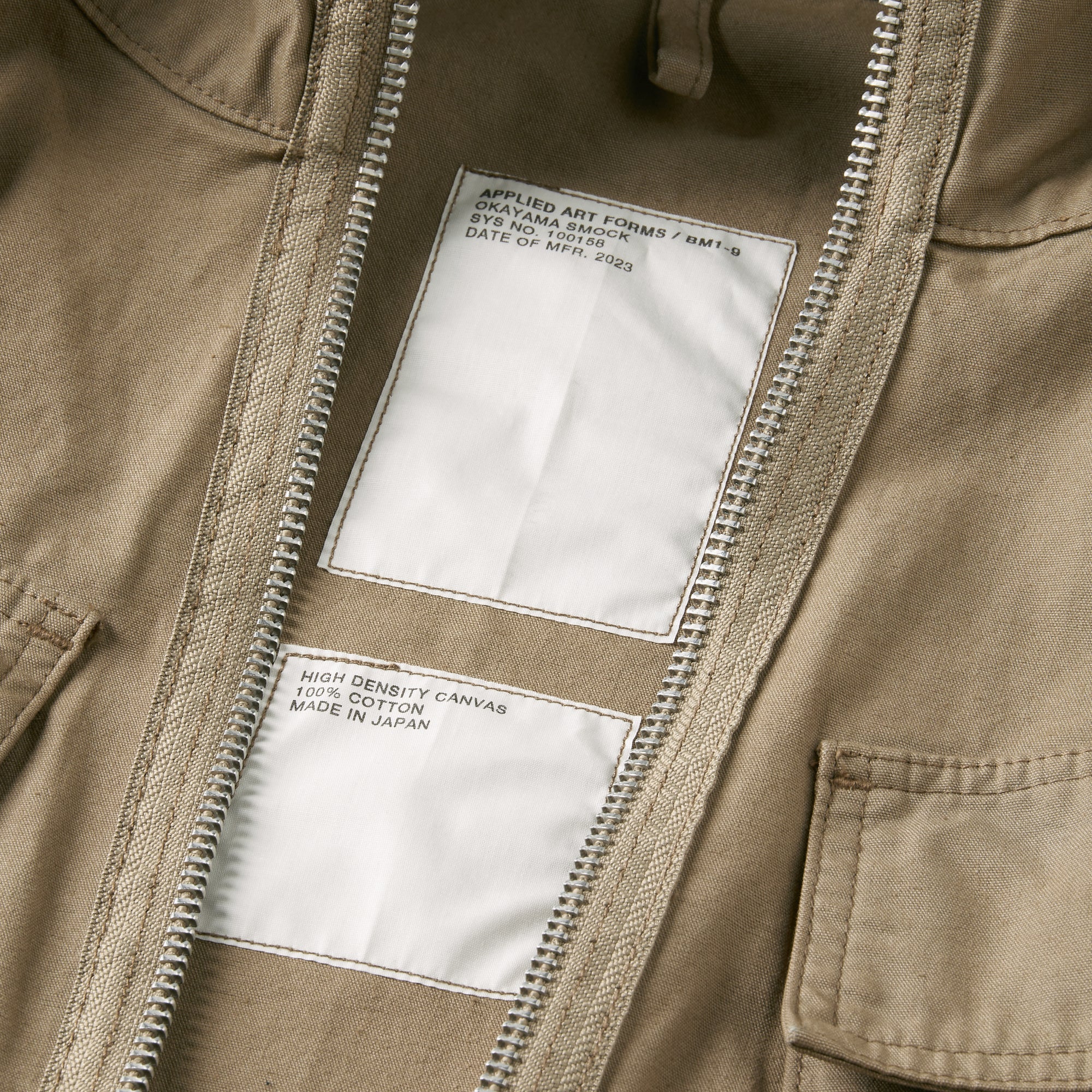 100% cotton high density Japanese canvas Inspired by vintage US navy smocks Exposed zipper Patch pockets Pockets in side seams Inside pockets with tape button closure Hood, hem and sleeves adjustable 100% Cotton Made in Japan