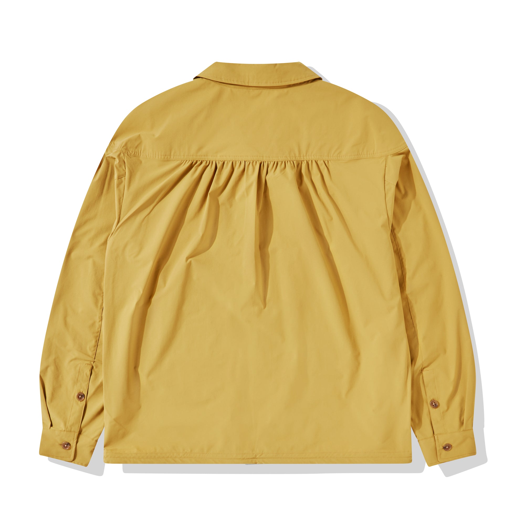 Light weight polyester fabricBack hem gatheringWater repellent Cap shoulder constructionBack yoke gatheringConcealed front pocketTonal embroidery