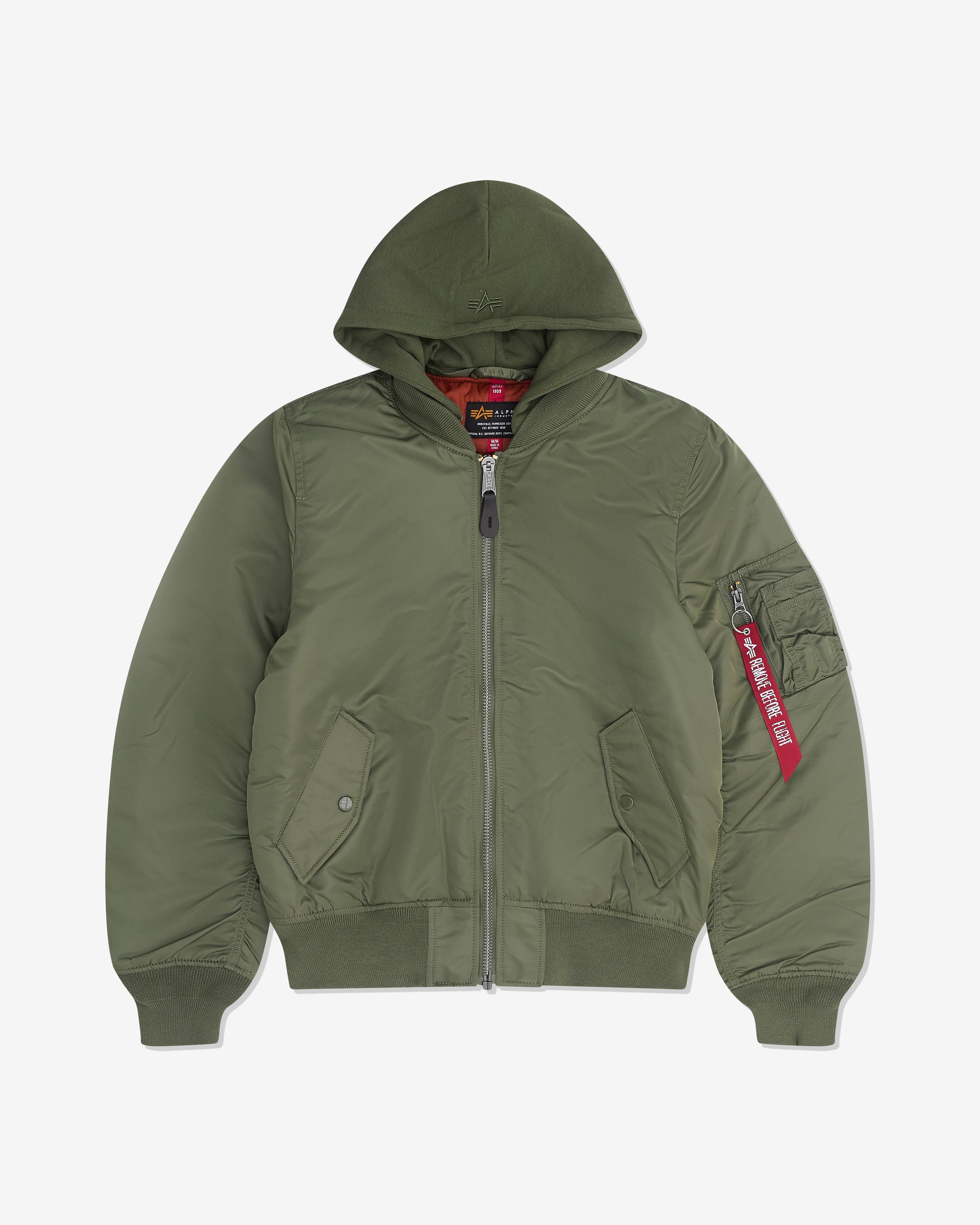 HoodedButton flap front pocketsRib knit trimsZip fasteningContrast liningRear printed graphics