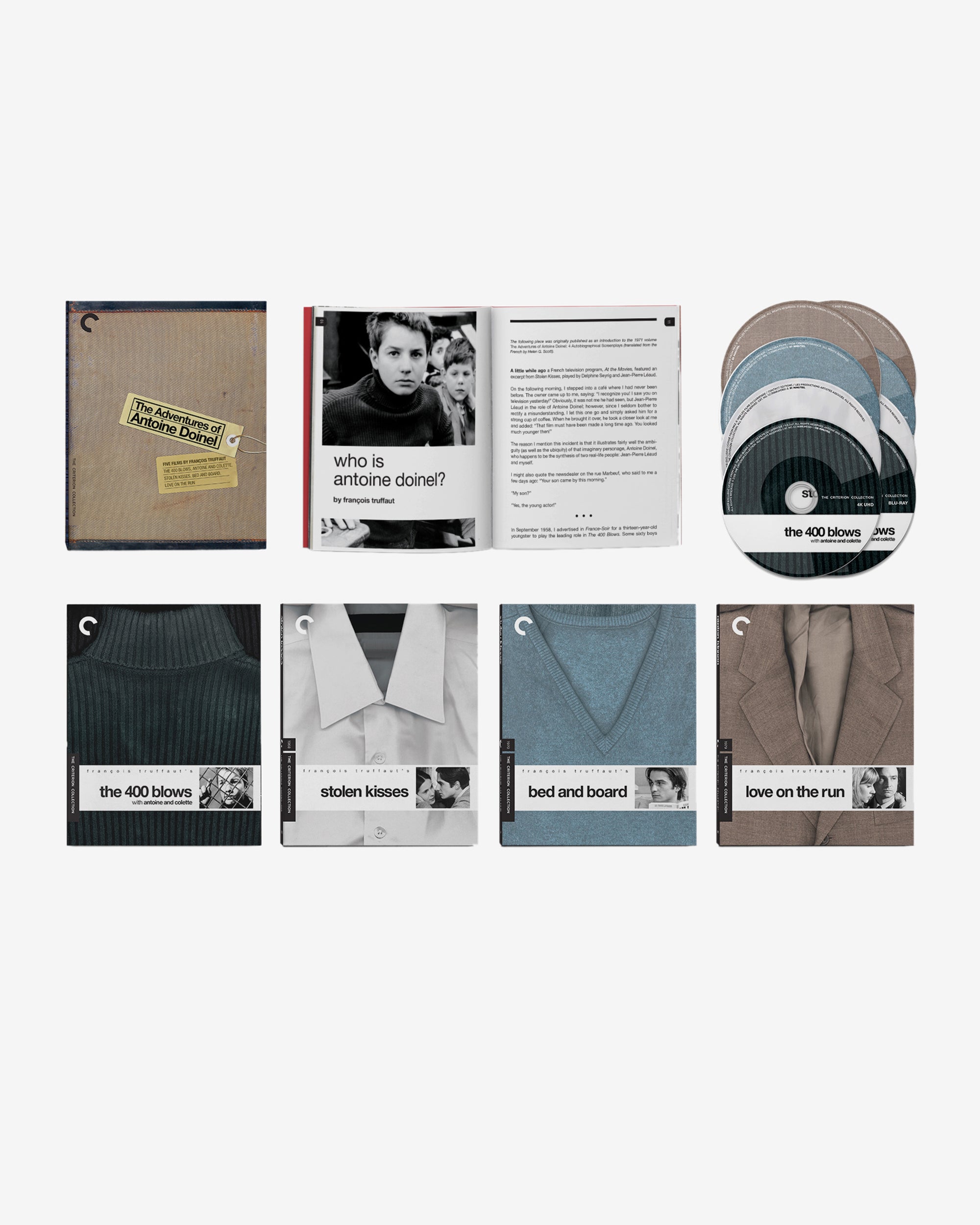 The release of François Truffaut’s The 400 Blows in 1959 shook world cinema to its foundations. The now-classic portrait of troubled adolescence introduced a major new director in the cinematic landscape and was an inaugural gesture of the revolutionary French New Wave. But The 400 Blows not only introduced the world to Truffaut—it also unveiled his most indelible creation, Antoine Doinel. Initially patterned closely after Truffaut himself, the Doinel character (played by the irrepressible and iconic Jean-Pierre Léaud) reappeared in four subsequent films that knowingly portrayed his myriad frustrations and romantic entanglements, from his stormy teens through marriage, children, divorce, and adulthood. This box set presents Truffaut’s celebrated saga in its entirety: the feature films The 400 Blows, Stolen Kisses, Bed and Board, and Love on the Run, and the short subject Antoine and Colette.