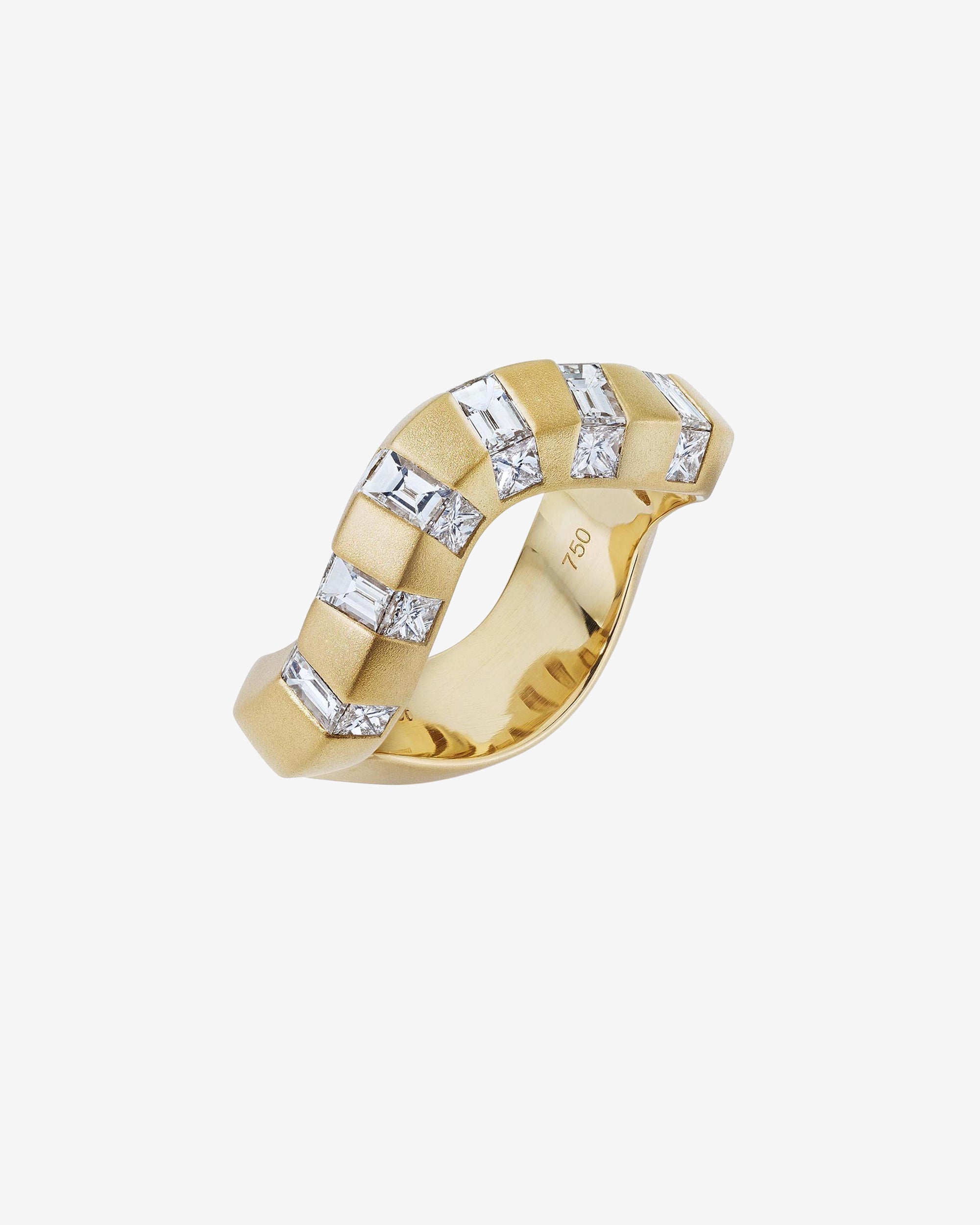 The Nemes collection is a collection that fuses futurism with ancient graphics. Dyne explores the interplay of emerald and white diamonds, crafting unisex pieces that blend precision with elegance. Each stone is custom cut, showcasing meticulous craftsmanship in minimalist settings that merge complex techniques with contemporary design.