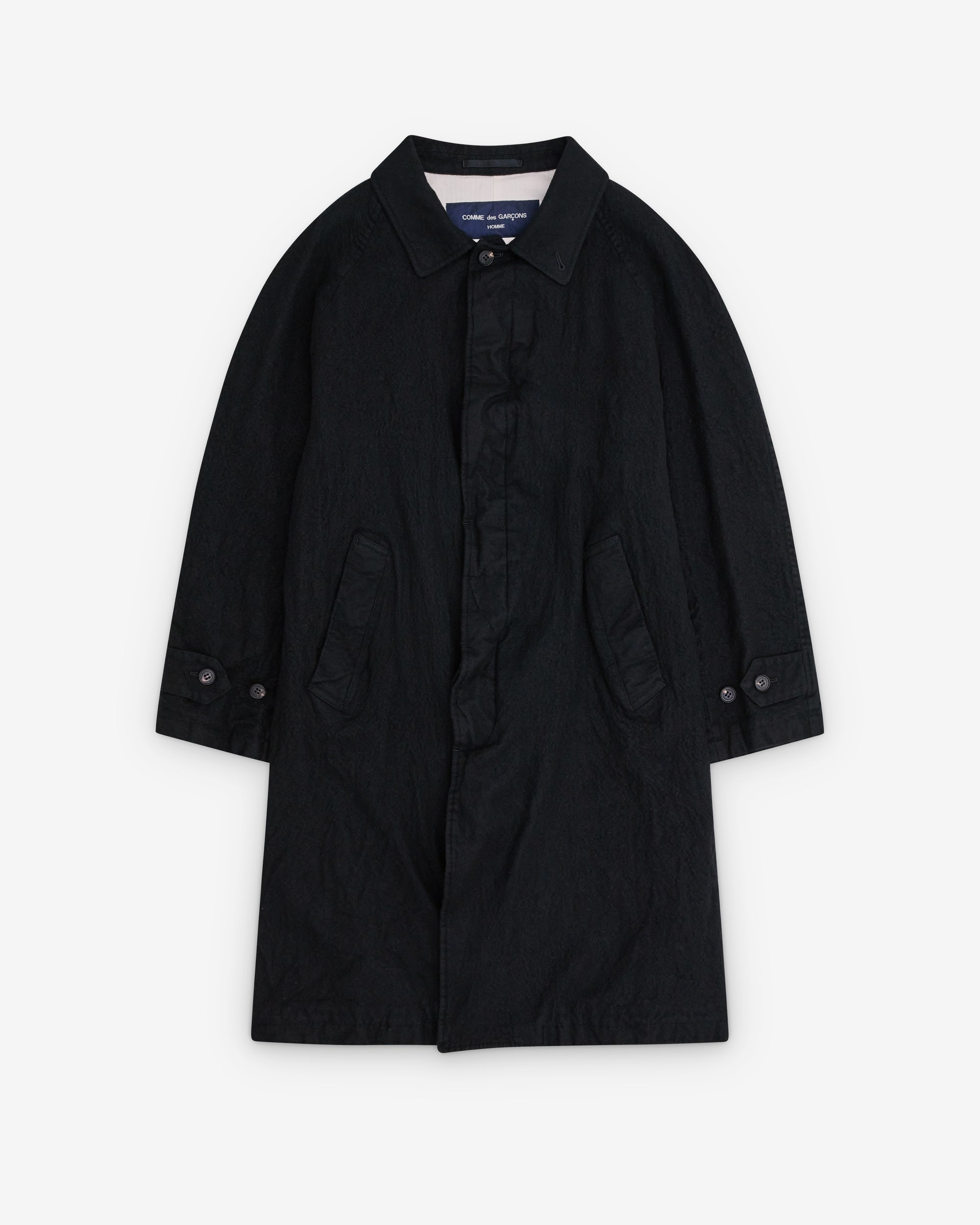 Concealed button placketTwo slant side pocketsButtoned cuffsStand collarBack vent