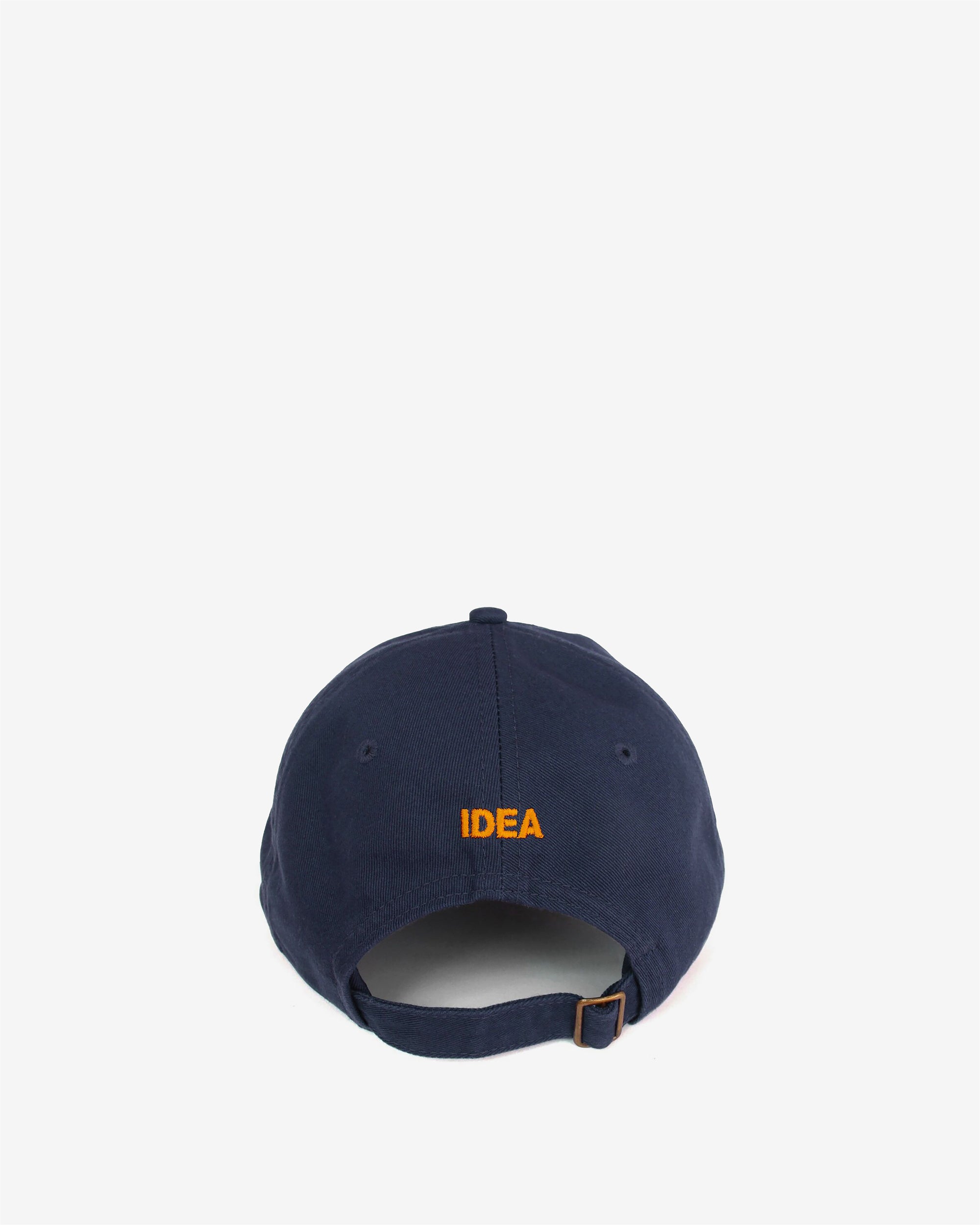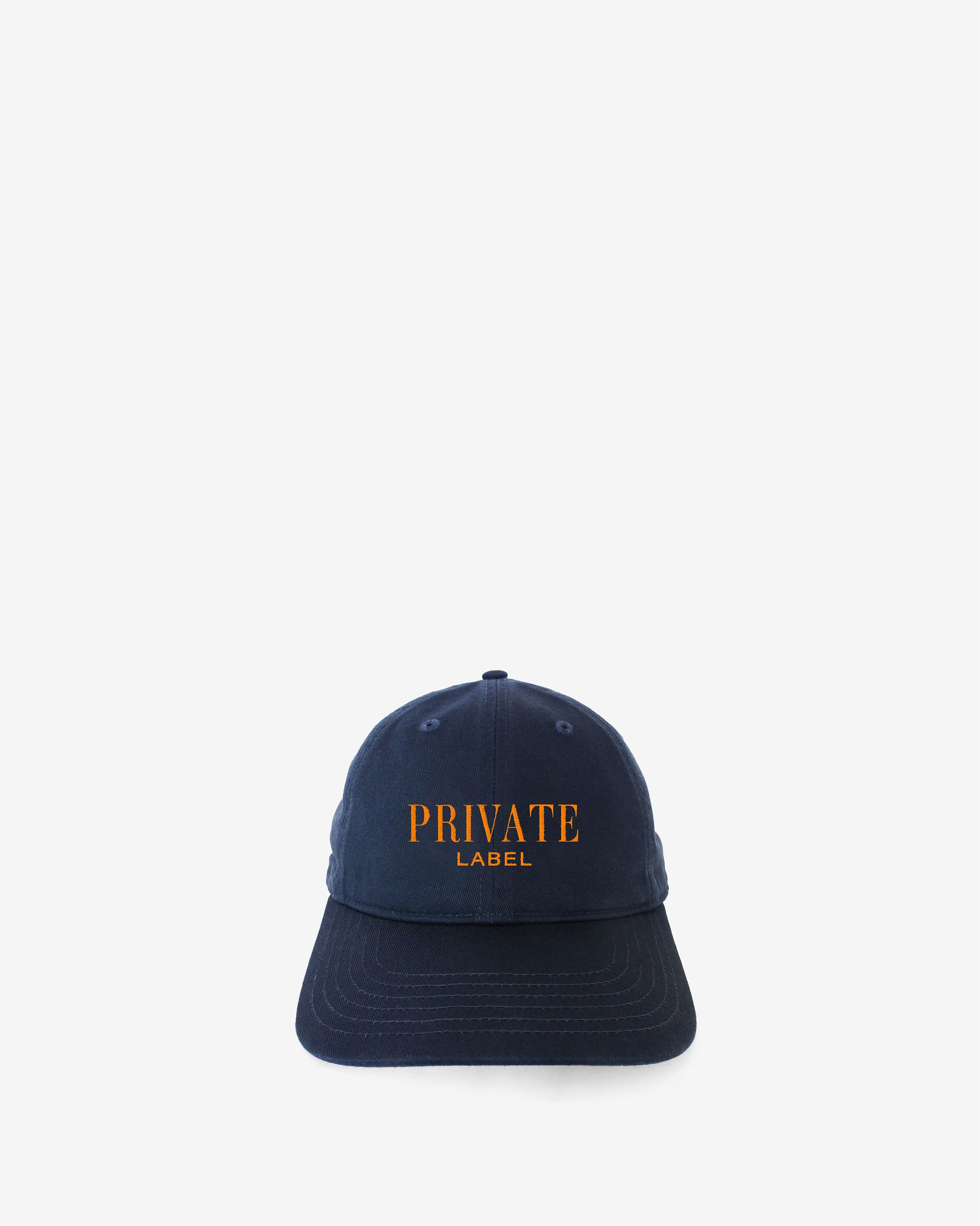 100% organic cotton IDEA hat. PRIVATE LABEL in orange embroidery on the front. Classic IDEA on the back. Navy all organic cotton classic unstructured six panel hat. Eco conscious :)