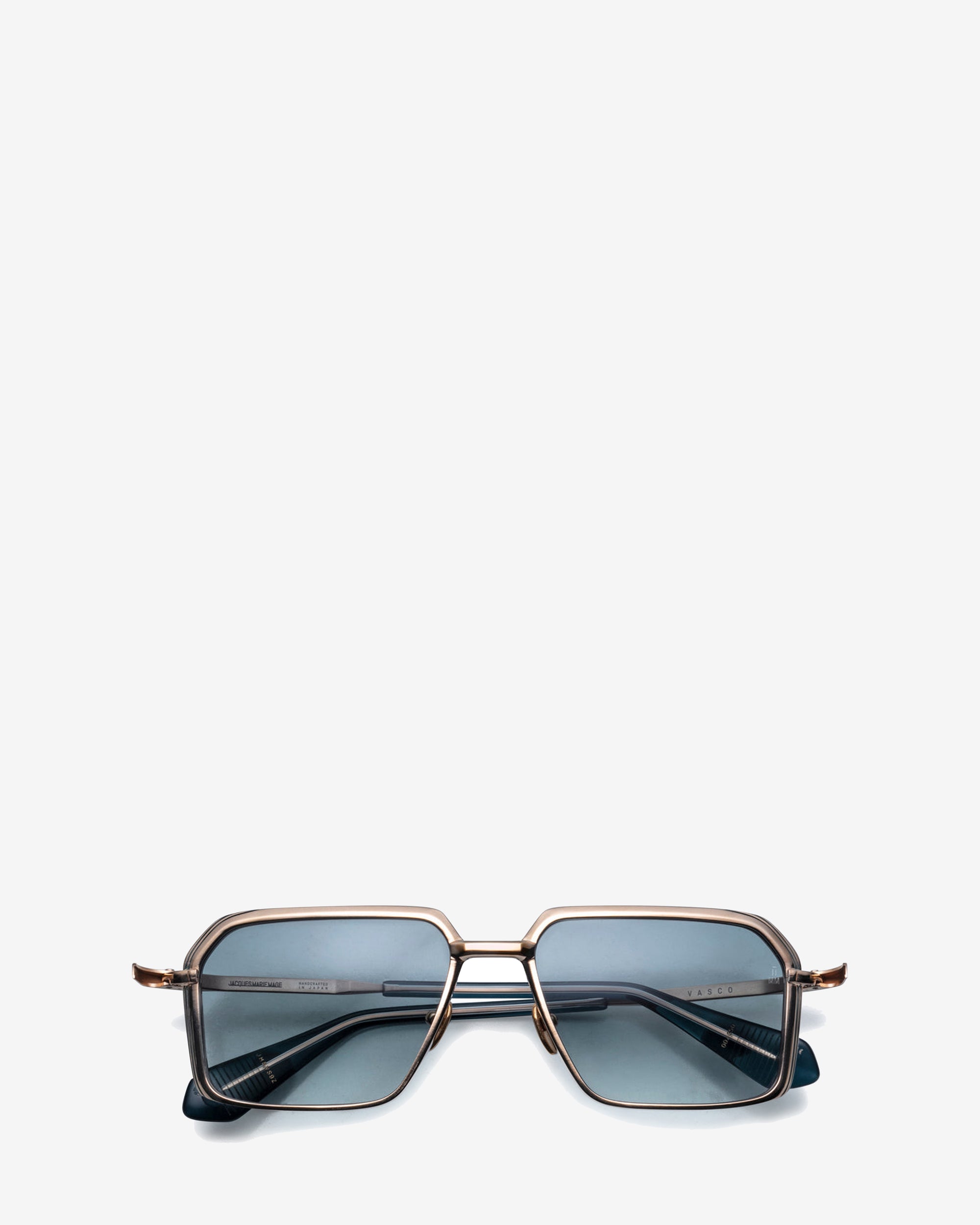 Light gold 100% beta titanium frame with blue acetate accents and blue gradient lensesLight gold hardwareHaine gradient CR39 lensesFrame shape: rectangular100% UV protection