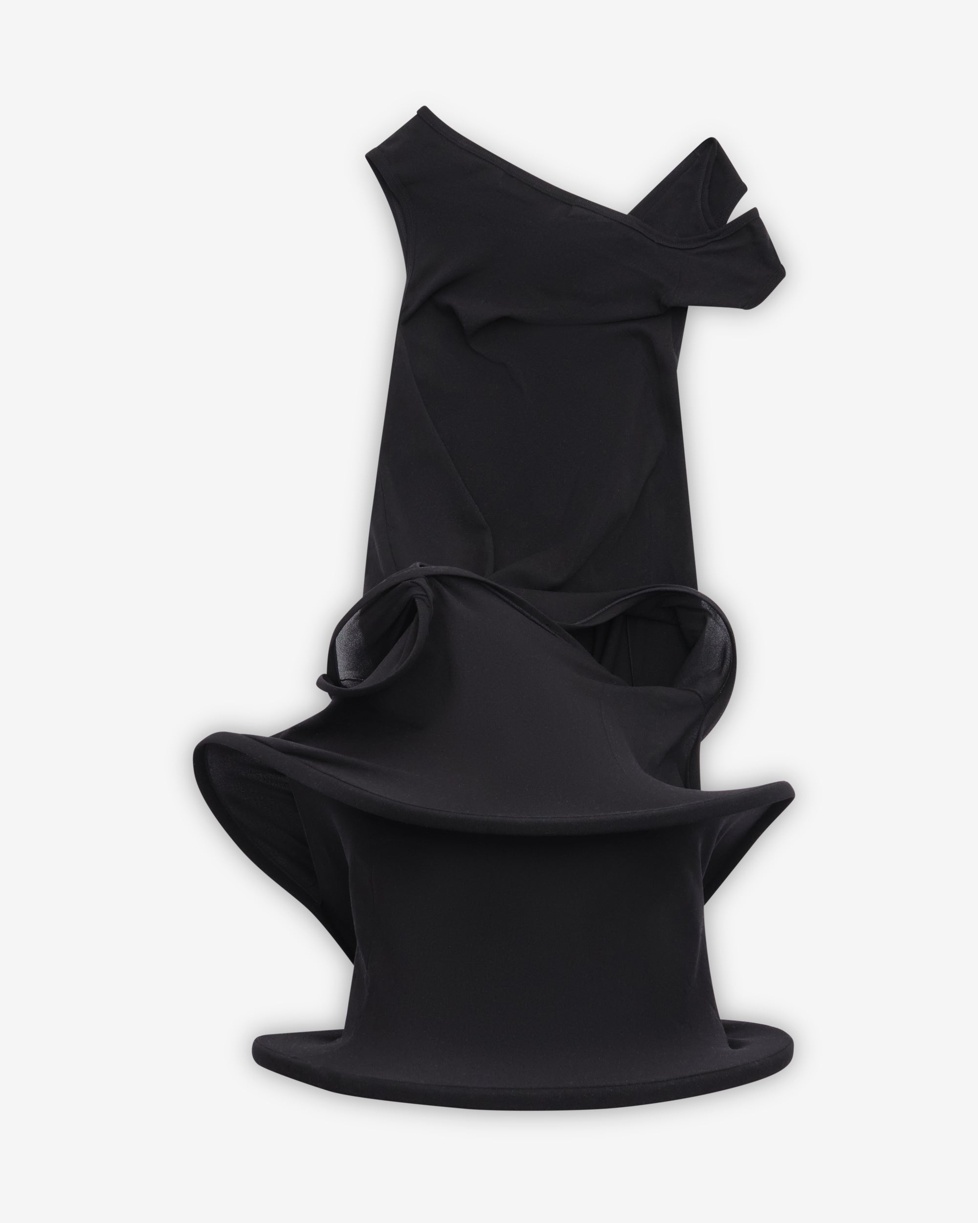 SleevelessGeometric, voluminous designMidi lengthCutouts throughout100% NylonMade in Japan