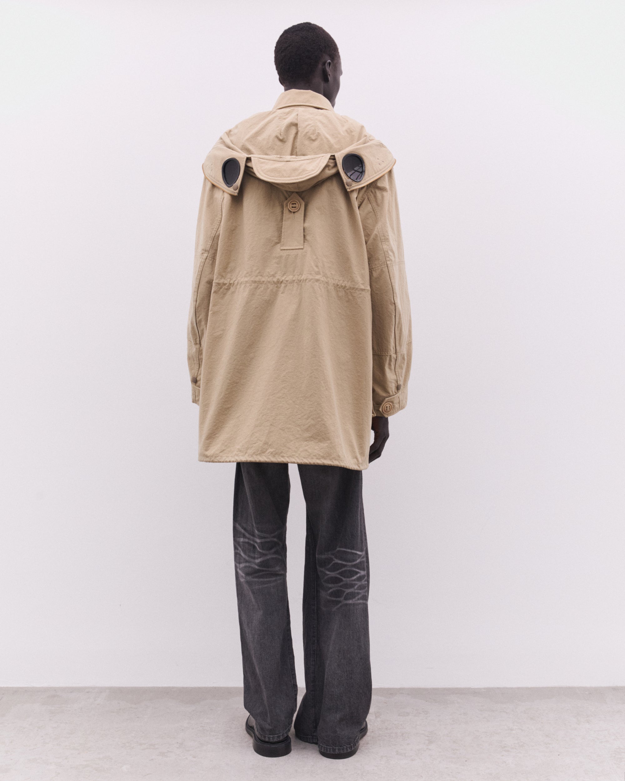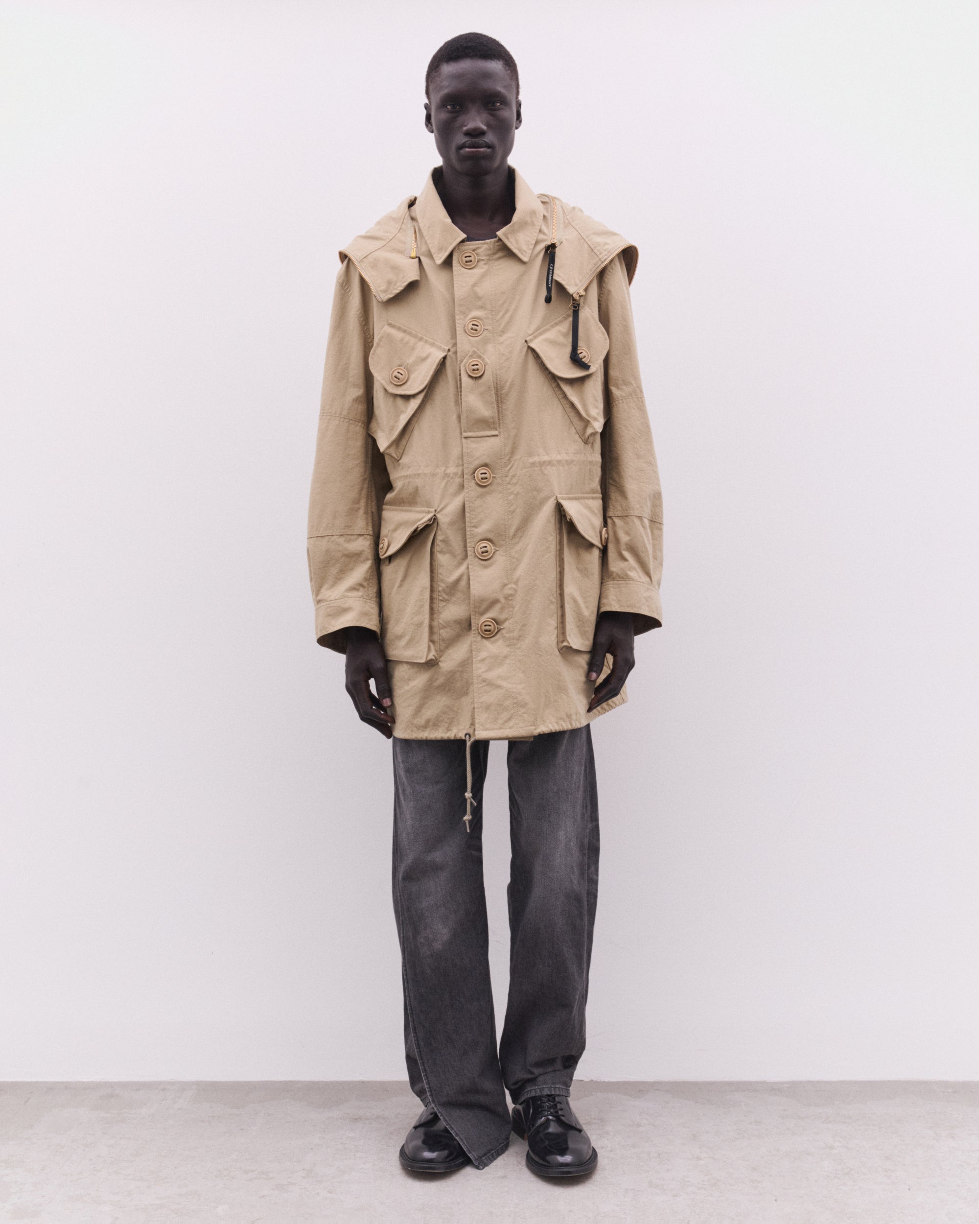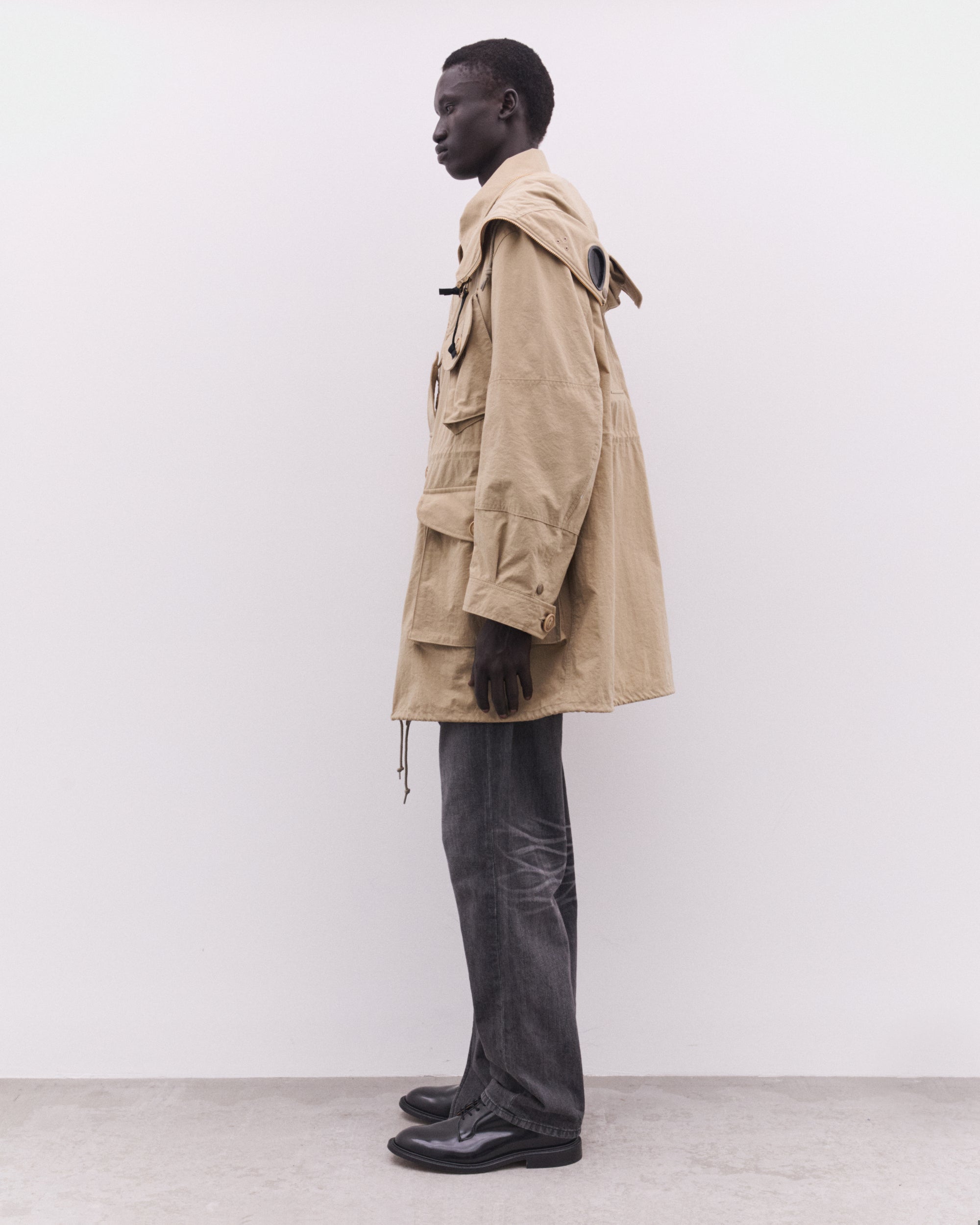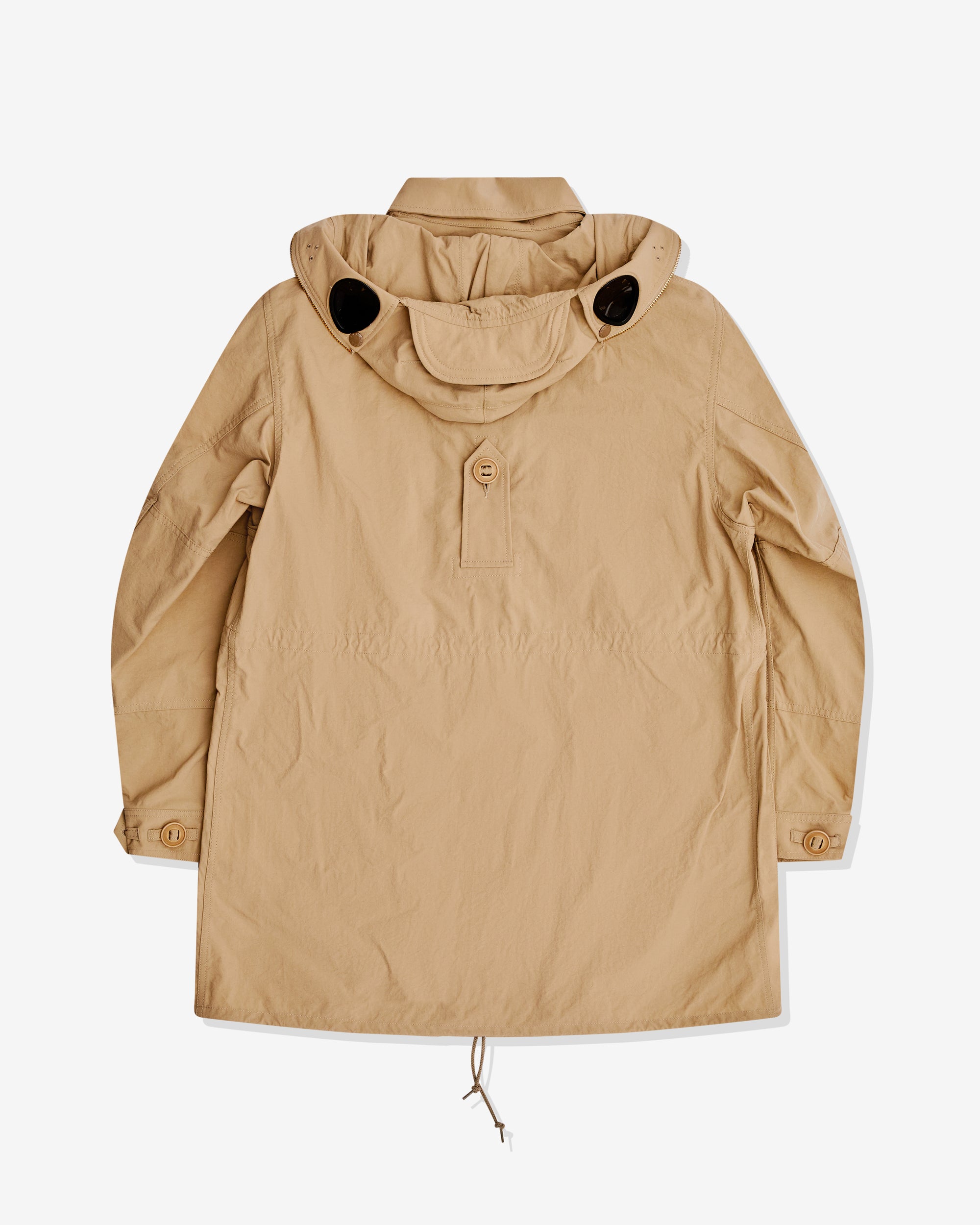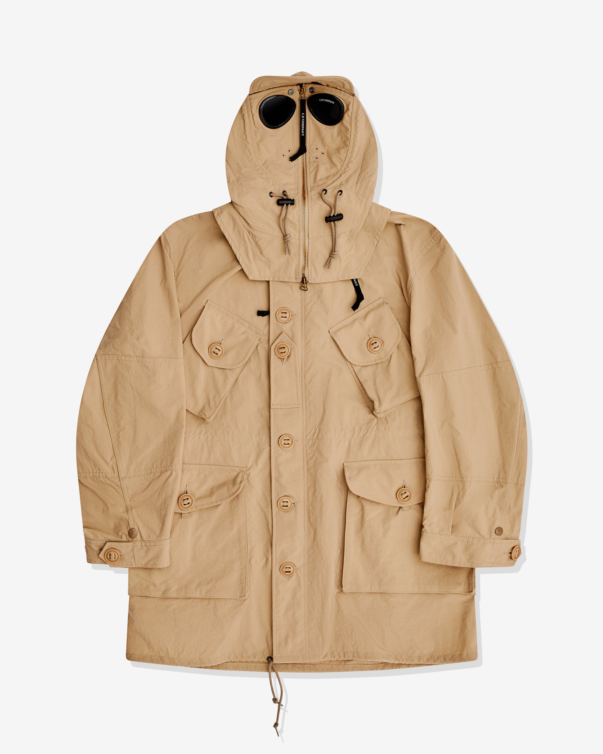 Multiple front pocketsDetachable Goggle hood with adjustable peakOff-center button fasteningDraw-string waistButtoned cuffs