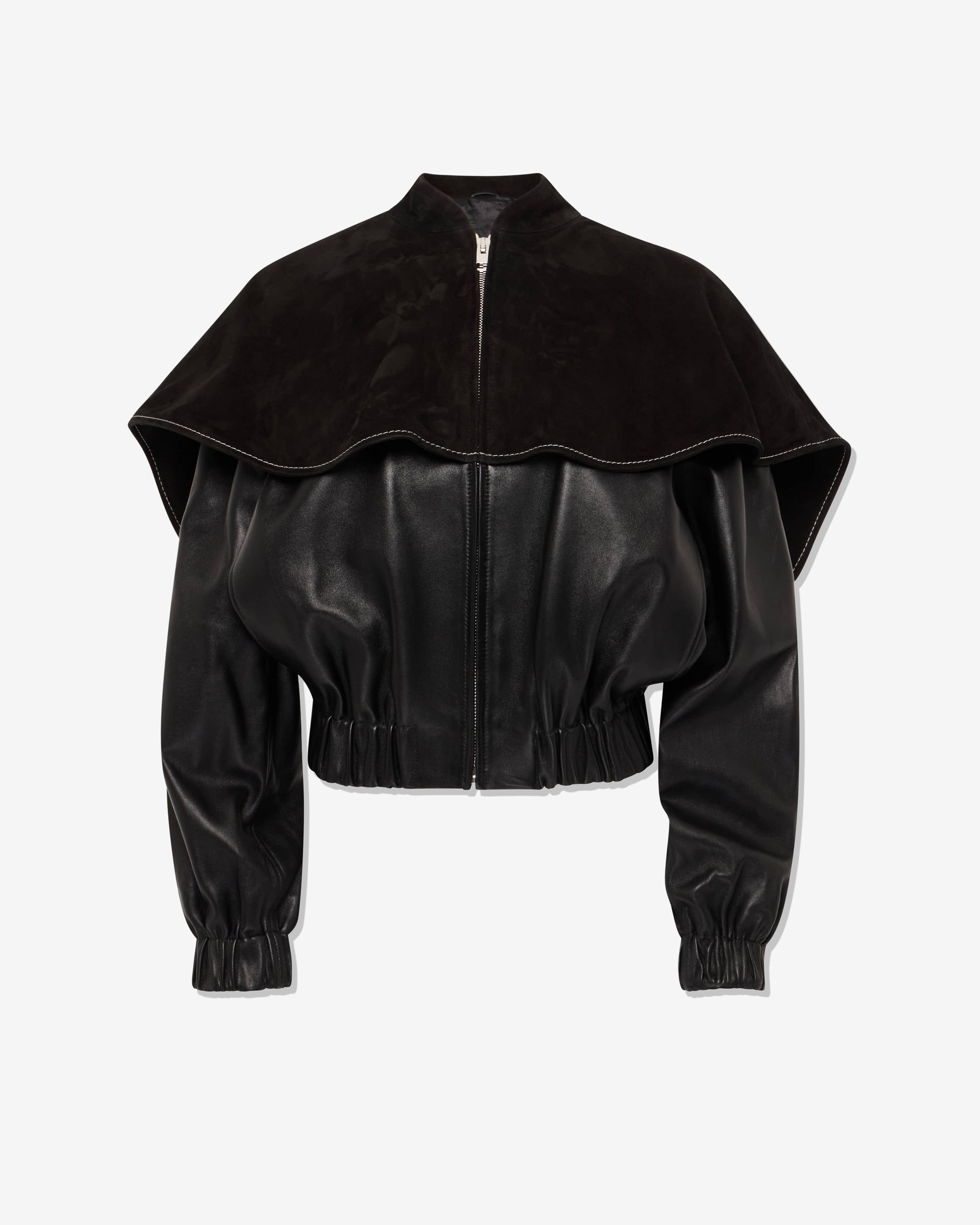 Soft Leather jacket complete with oversized suede umbrella collarCropped blouson fit Frontal zip fastening Dropped shoulderRushed elasticated cuff and hemSide pocketsSilver hardwareFully lined100% Sheepskin LeatherMade in Turkey