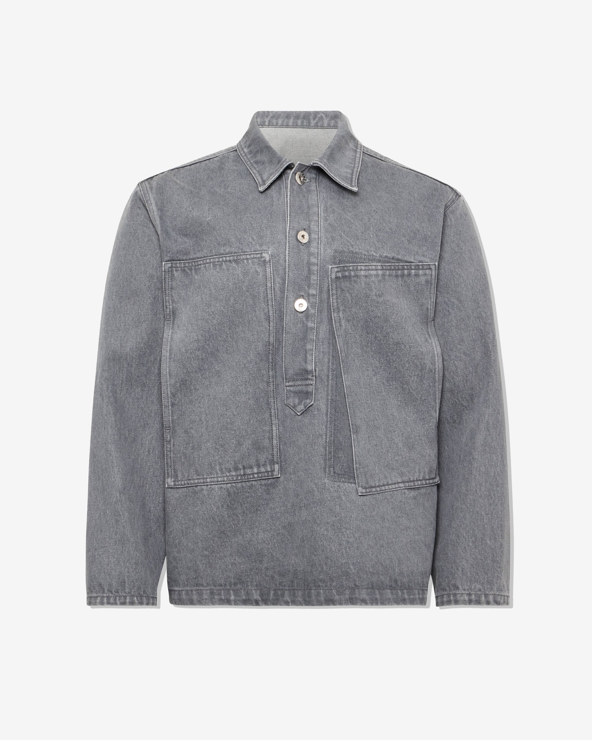 Relaxed fit rugby shirt with asymmetric slanted patch pocketsTonal topstitchingSilver buttonsLogo embossed raw leather patch at center backUnlined100% CottonMade in Portugal