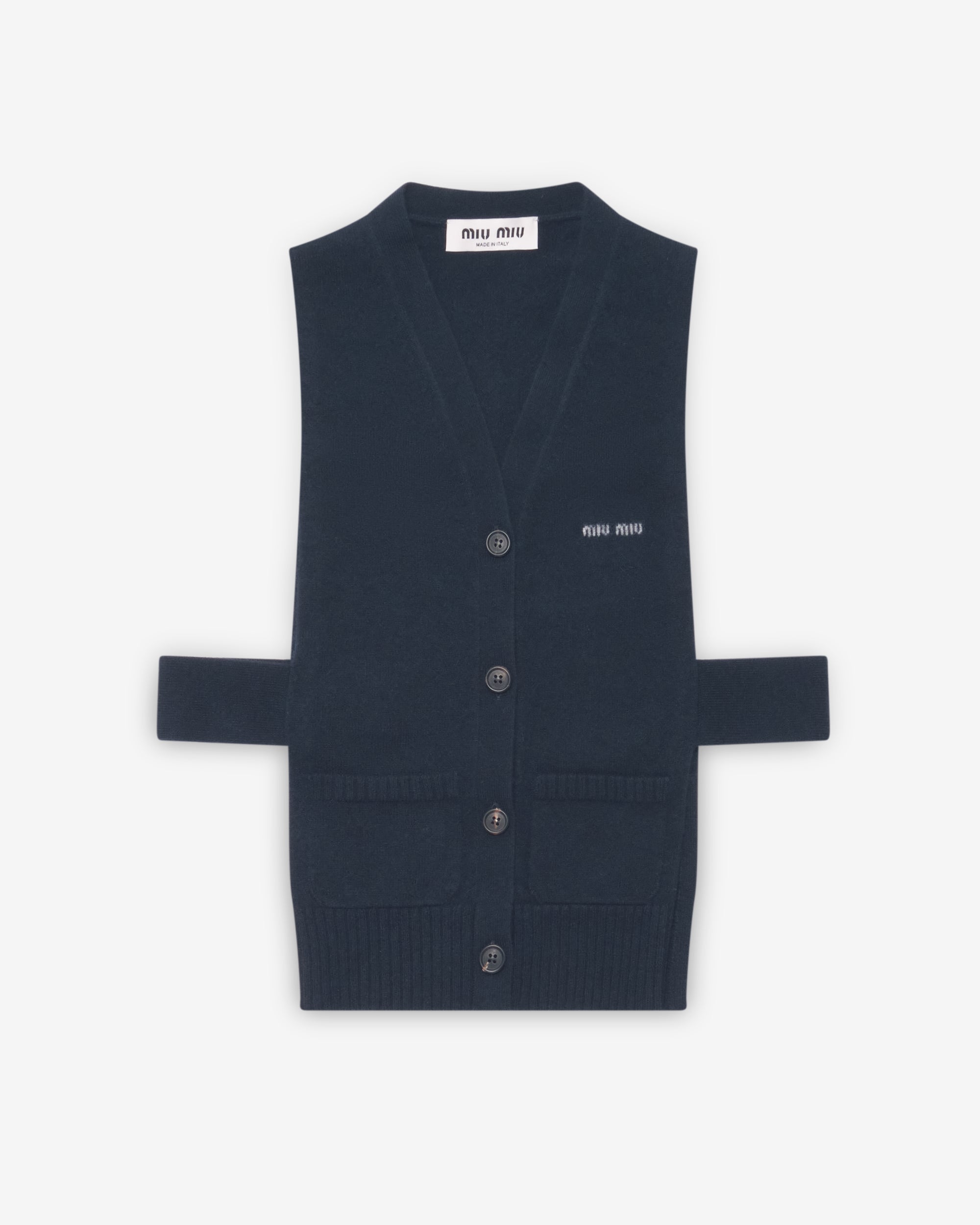 Jersey knitShort cutV-neckFront button closureFront pocketsSleeveless fitIntarsia logo100% CashmereMade in Italy