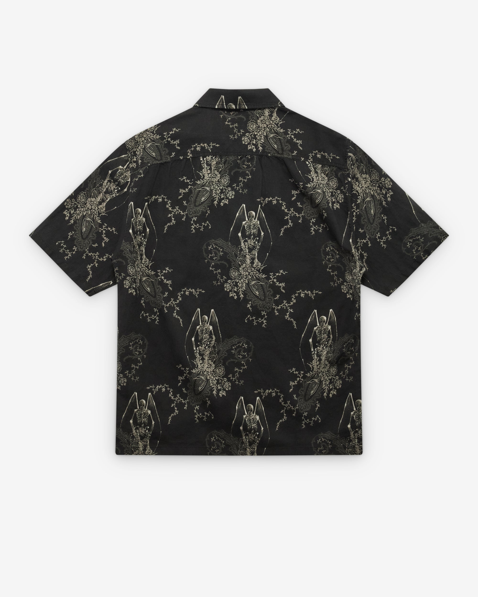 Classic spread collarFront button closureSingle chest pocketAll over print fabricBoxy fitShort sleeves