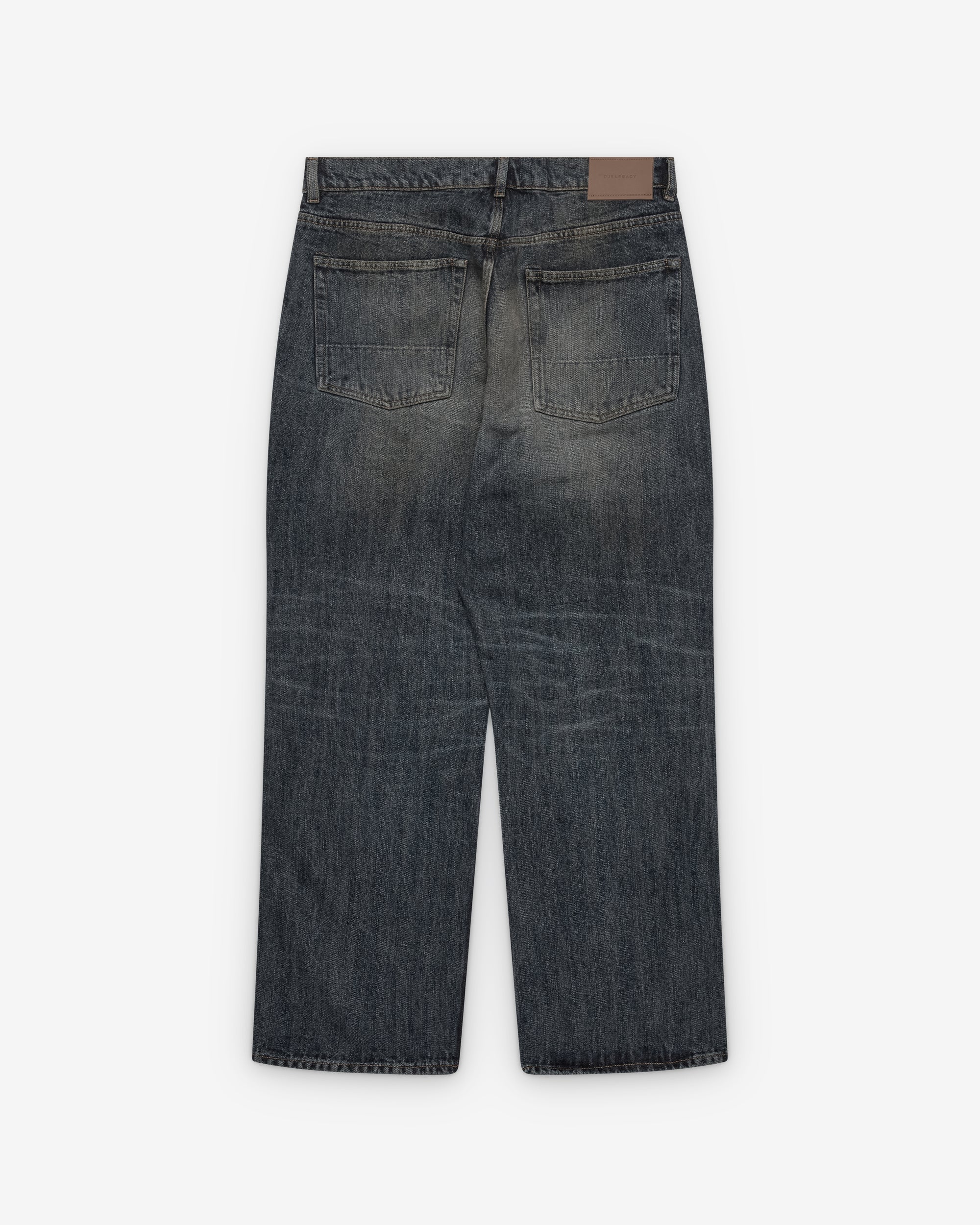 Heavy-weight bull denimStorm wash treatmentYKK zip flyMetal rivetsFive pockets with reinforced back pocketsOur Legacy rubber patchRelaxed fit with wide straight leg
