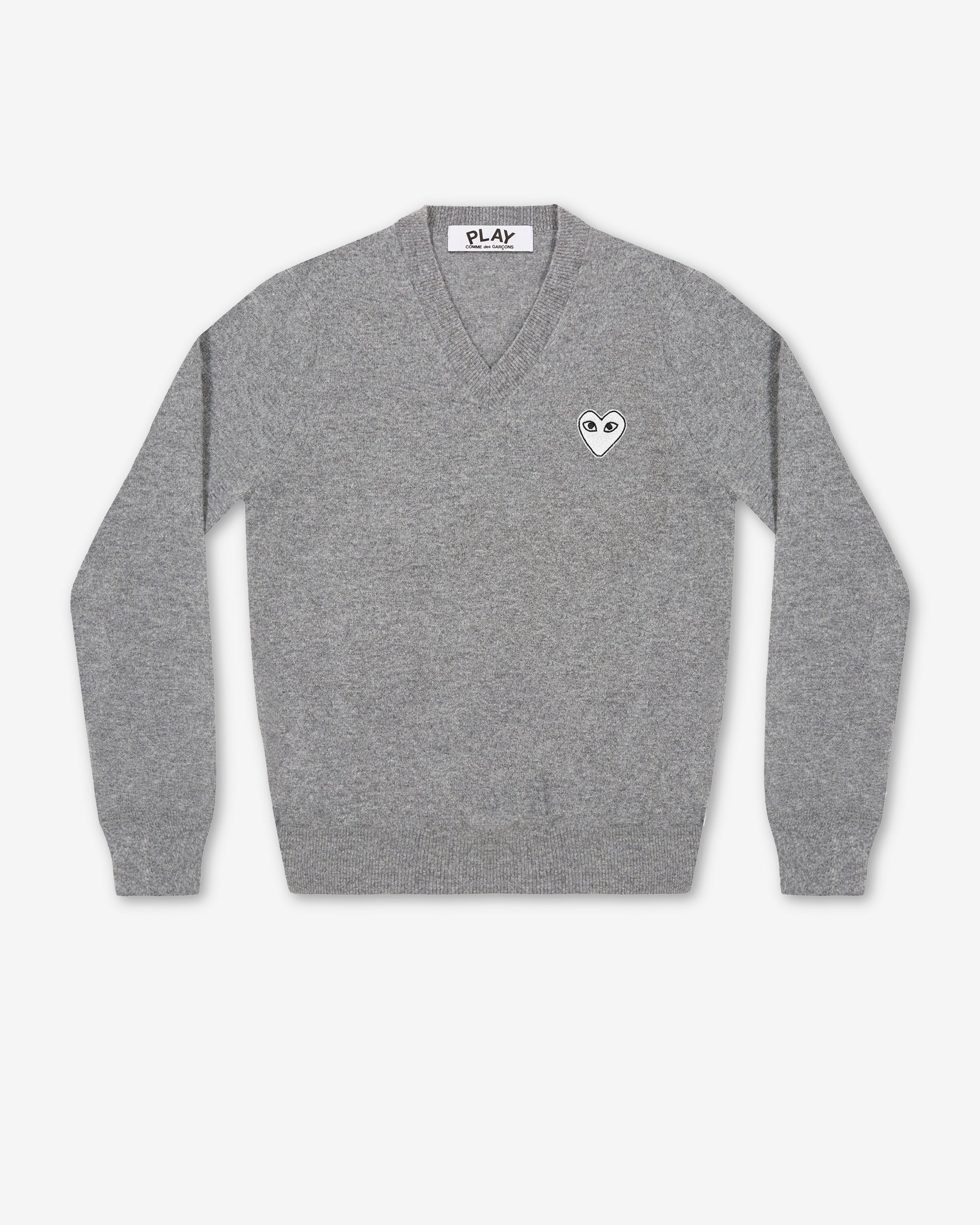 Play Comme des Garçons White Heart V-Neck Sweater Light Grey