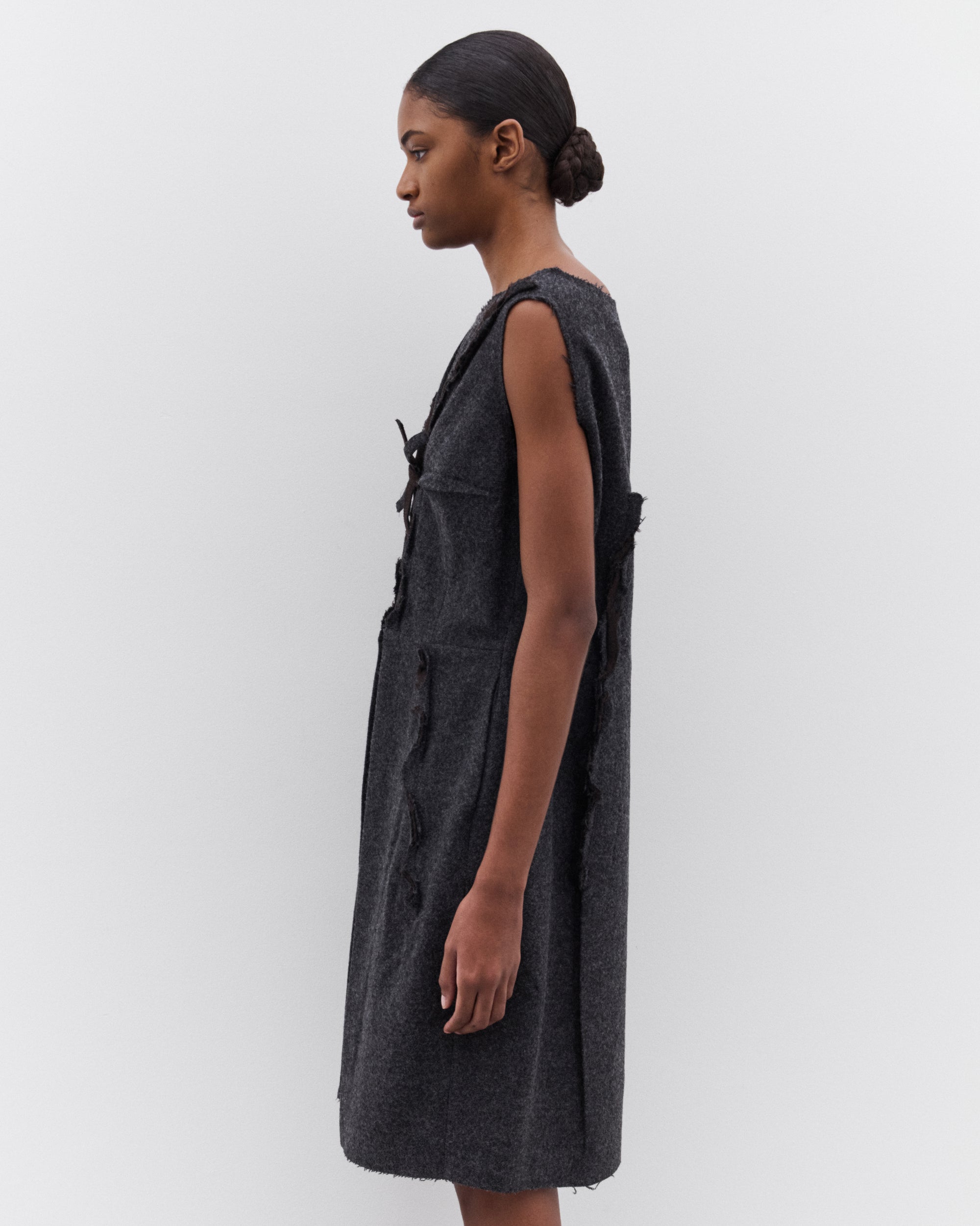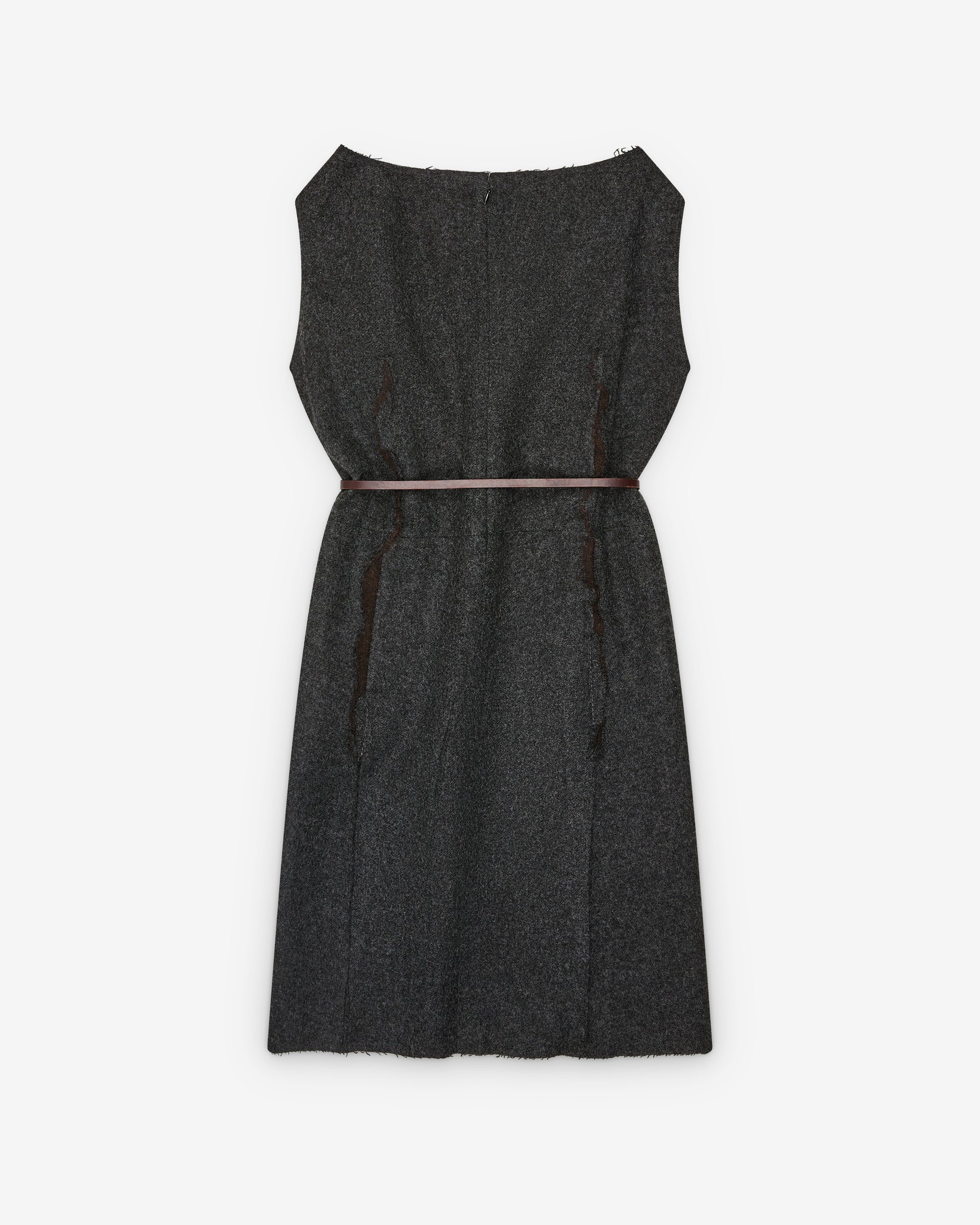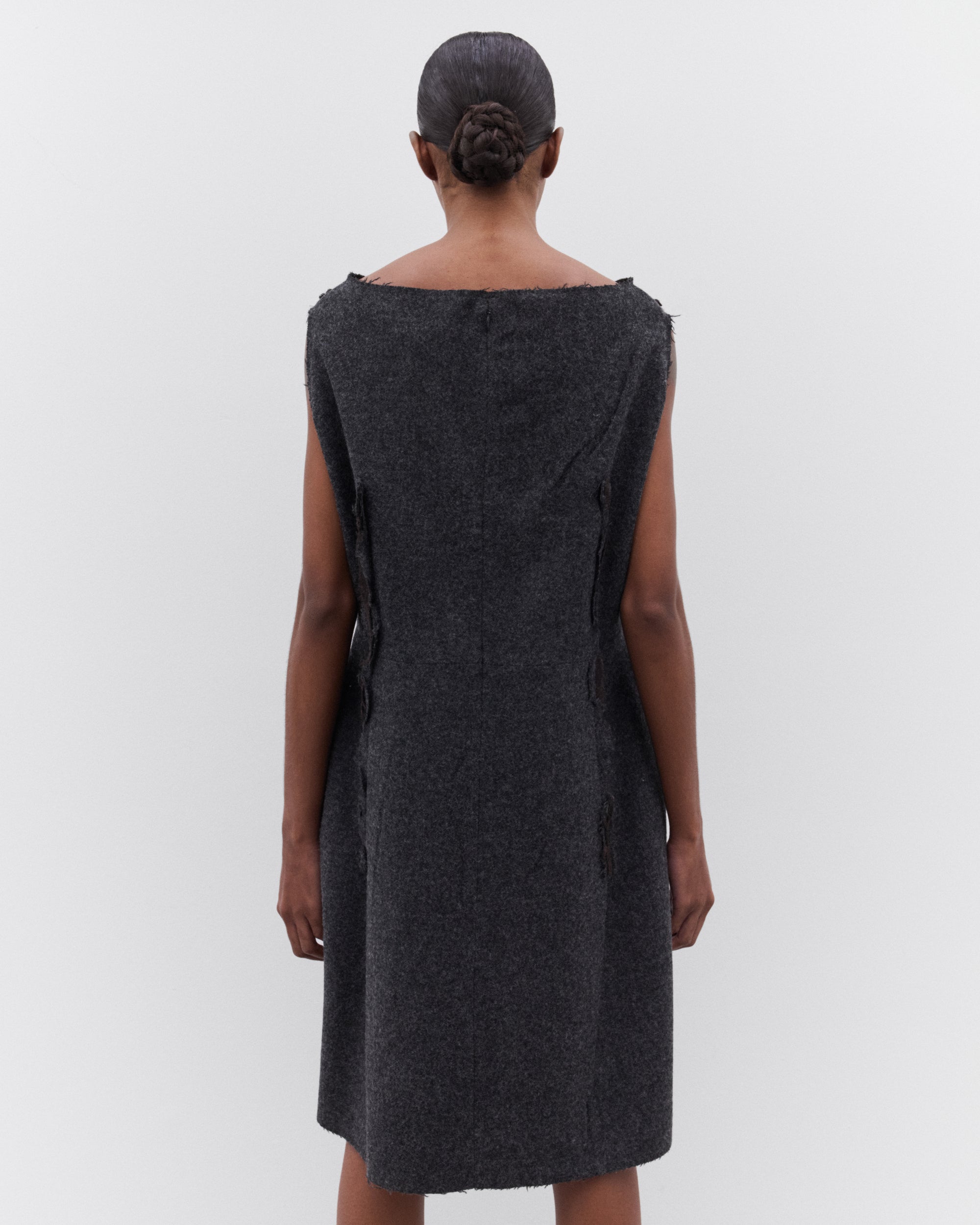 Oversized fitLined garmentBoat necklineCenter back zipper closureSleevelessInseam pocketsStraight hemRaw-cut details