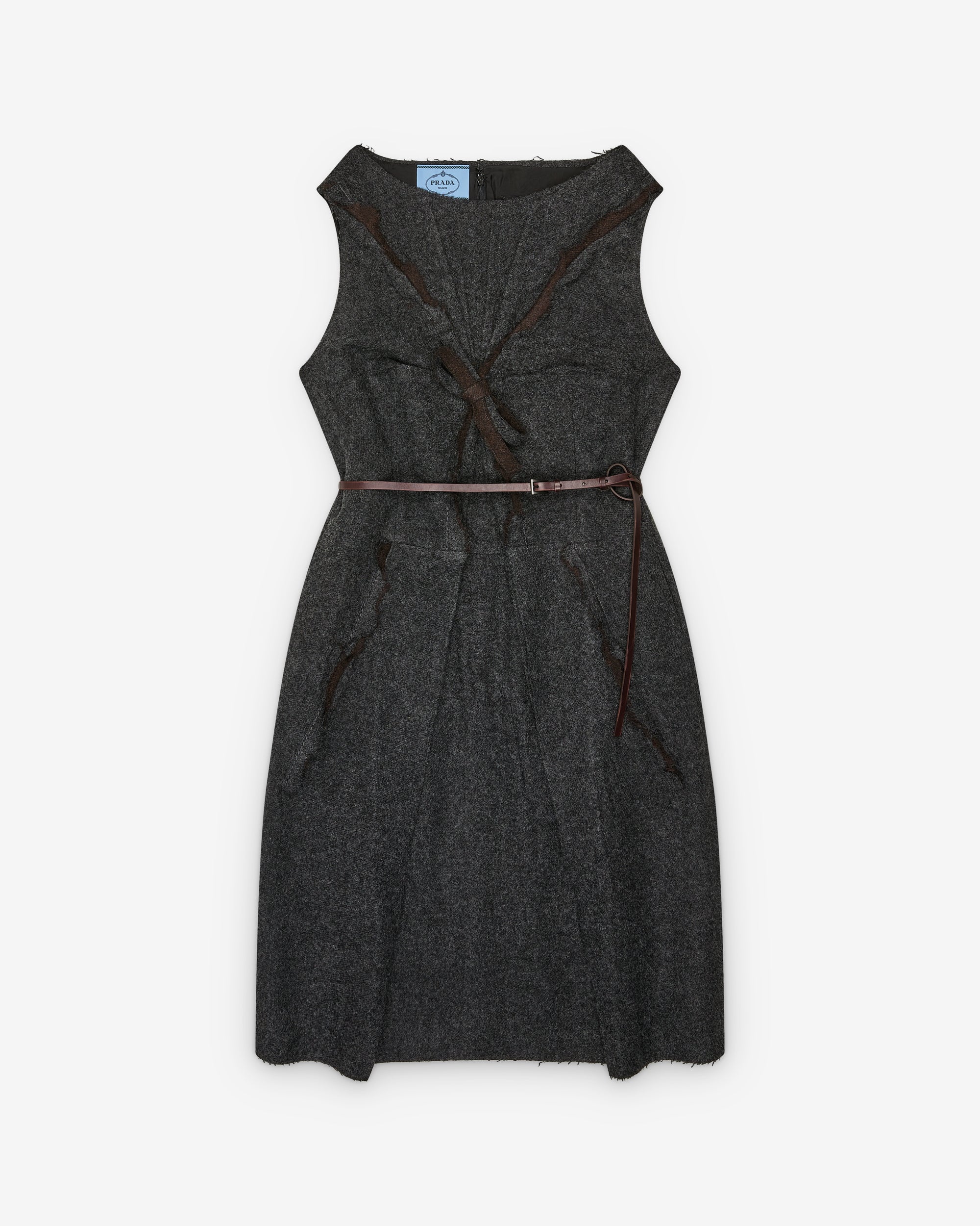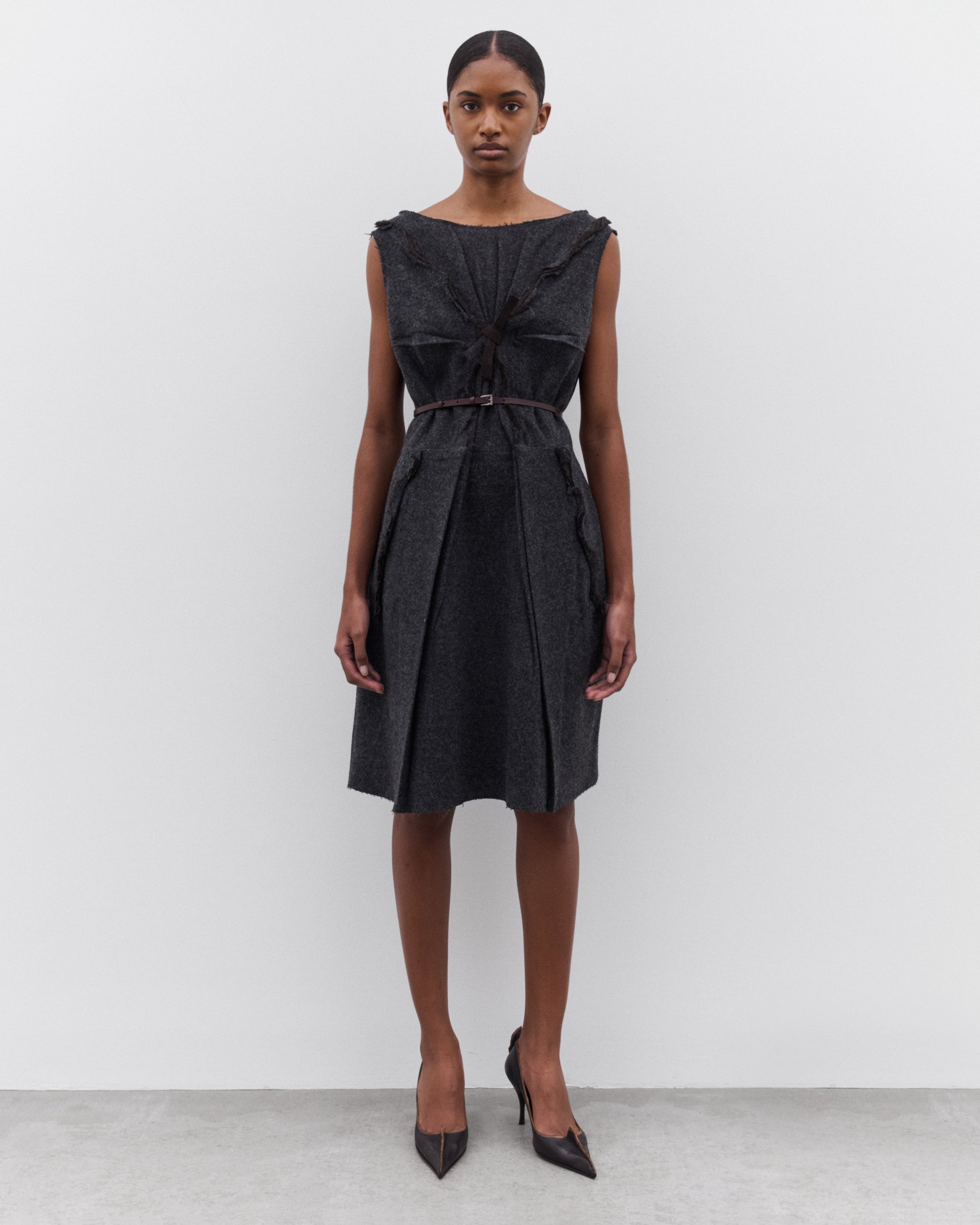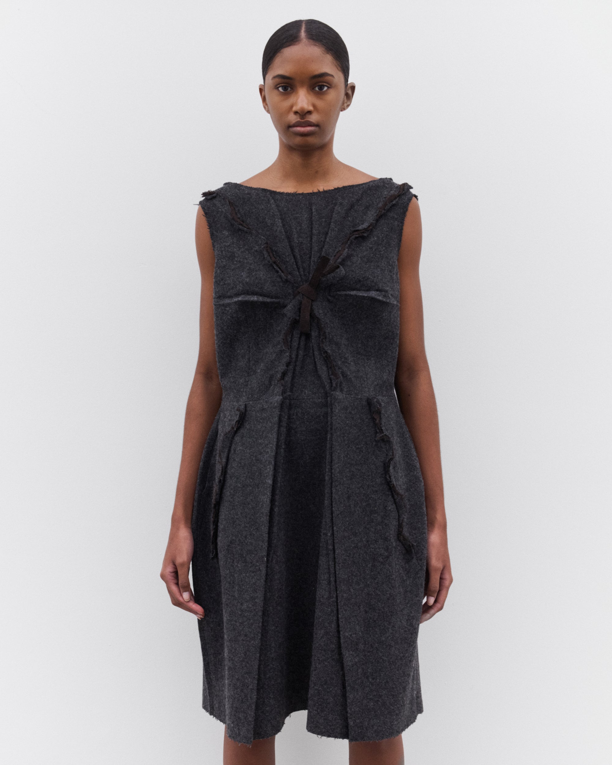 Oversized fitLined garmentBoat necklineCenter back zipper closureSleevelessInseam pocketsStraight hemRaw-cut details