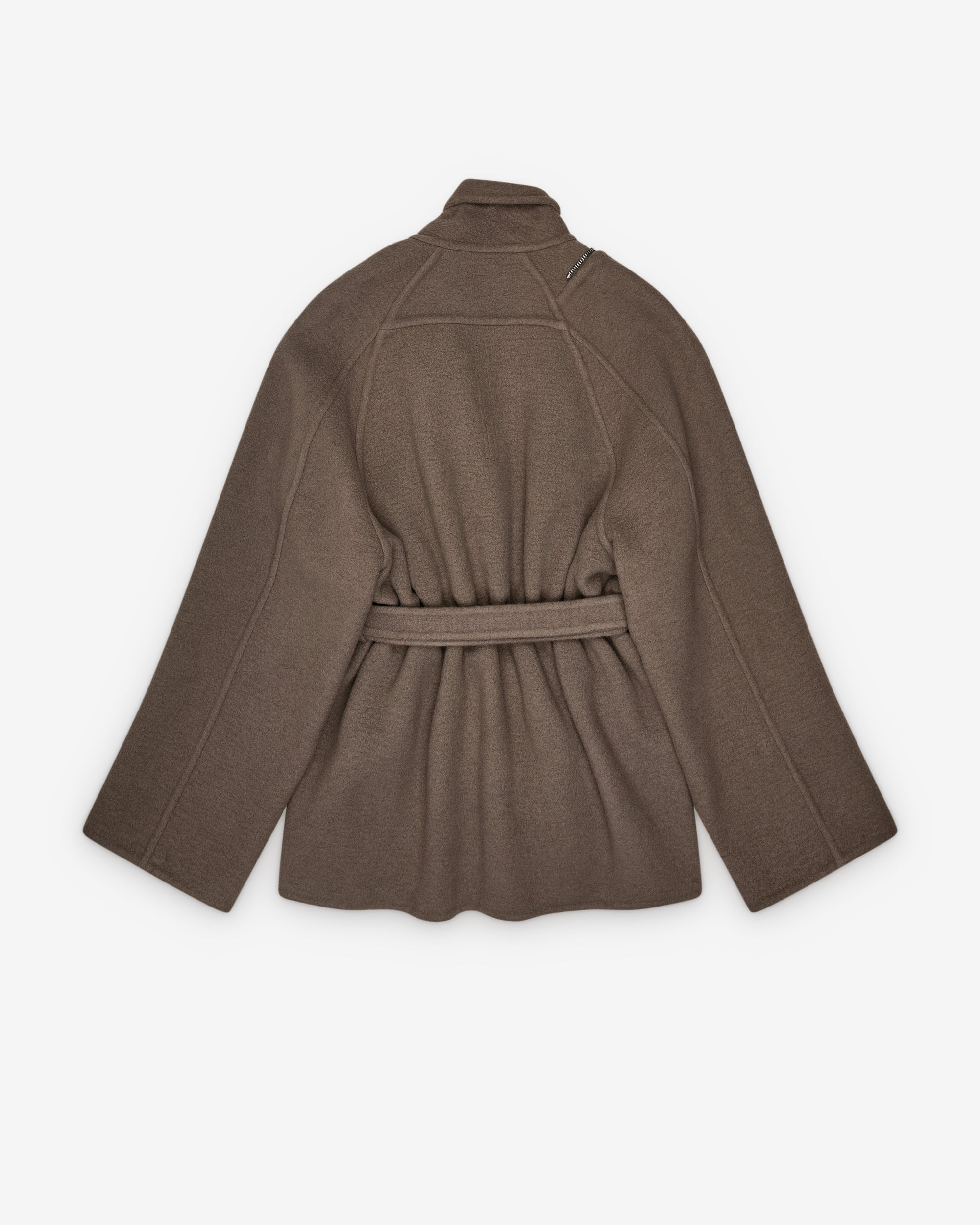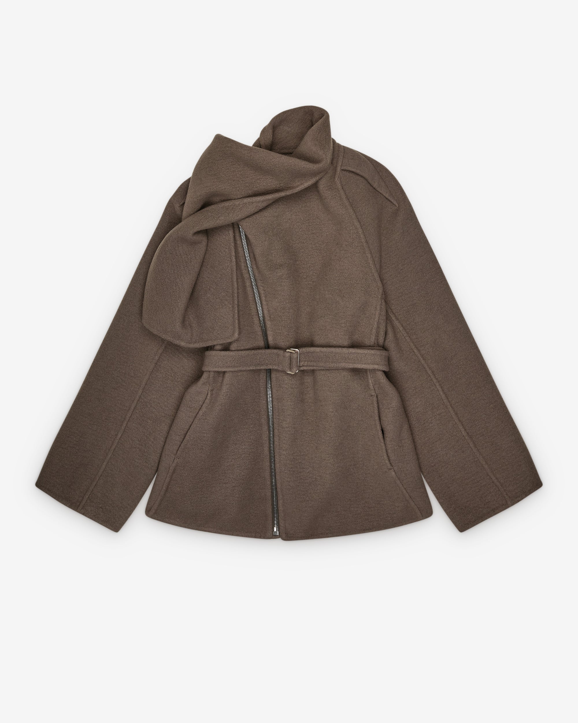 Long, wide sleevesOff center zipper closureAttached scarf segmentBuckle belt at waist100% CashmereMade in Italy