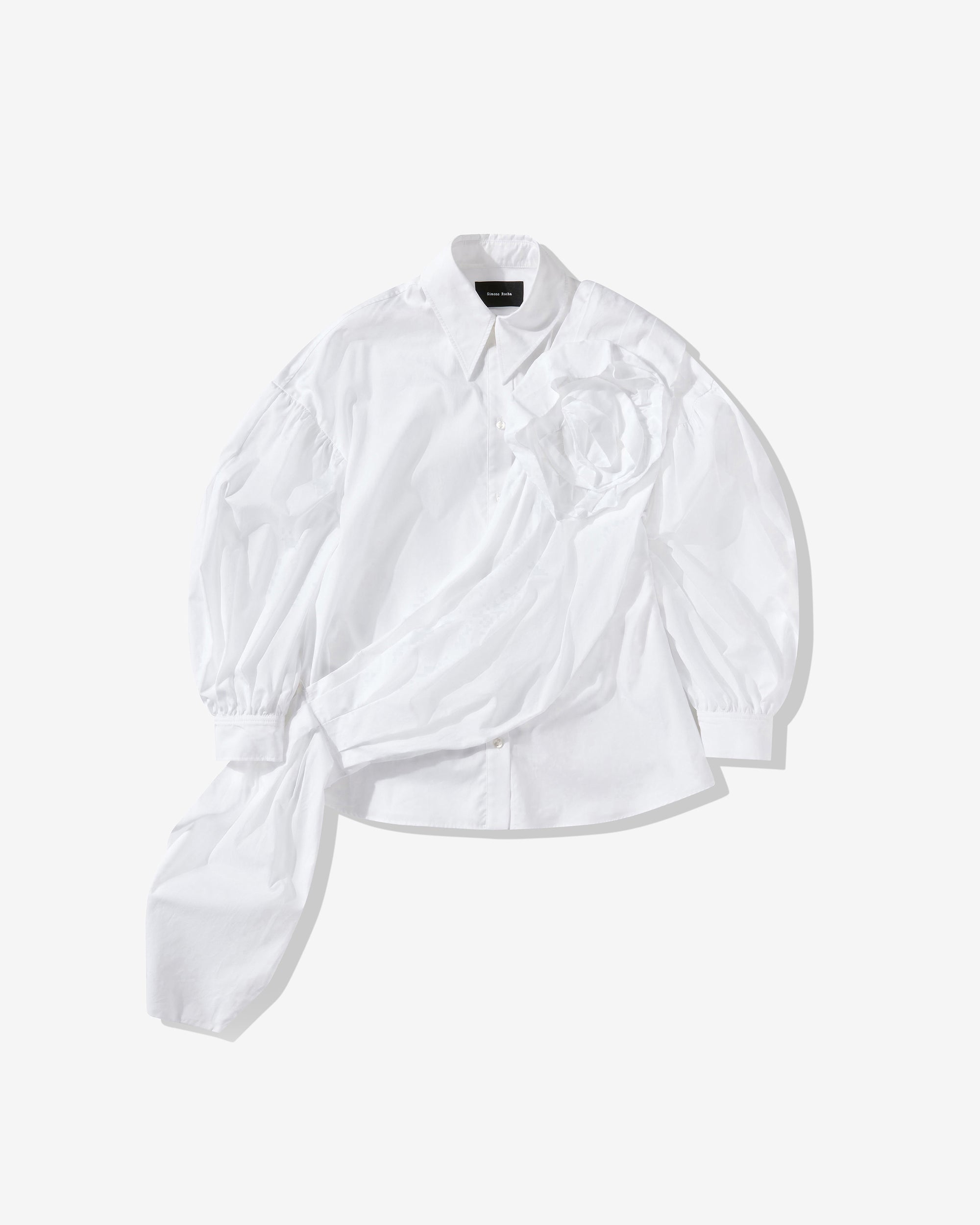 Point collarPressed rose detail at shoulderShoulder to waist wrap sashCurved hemPuff sleeveBox pleat at rear