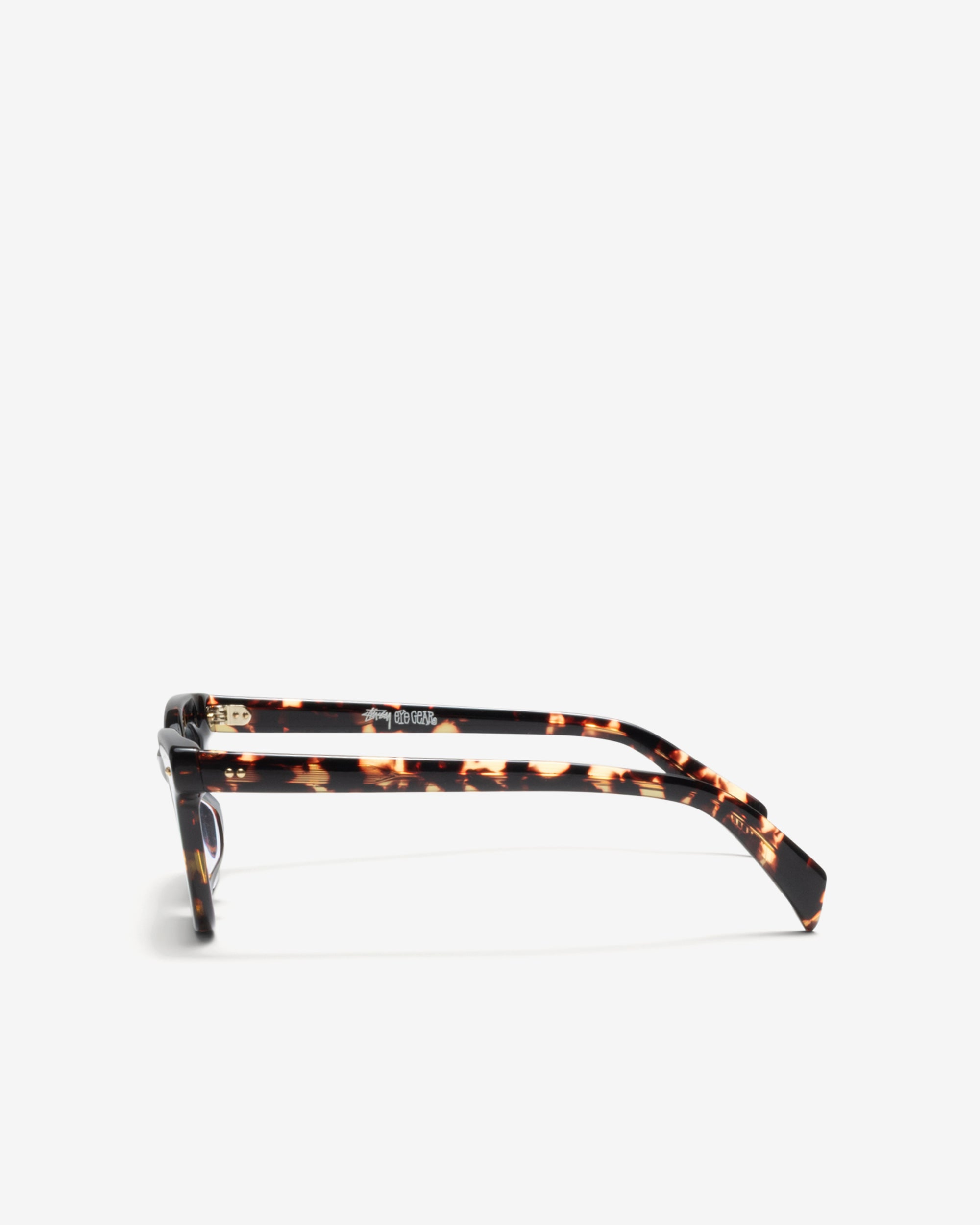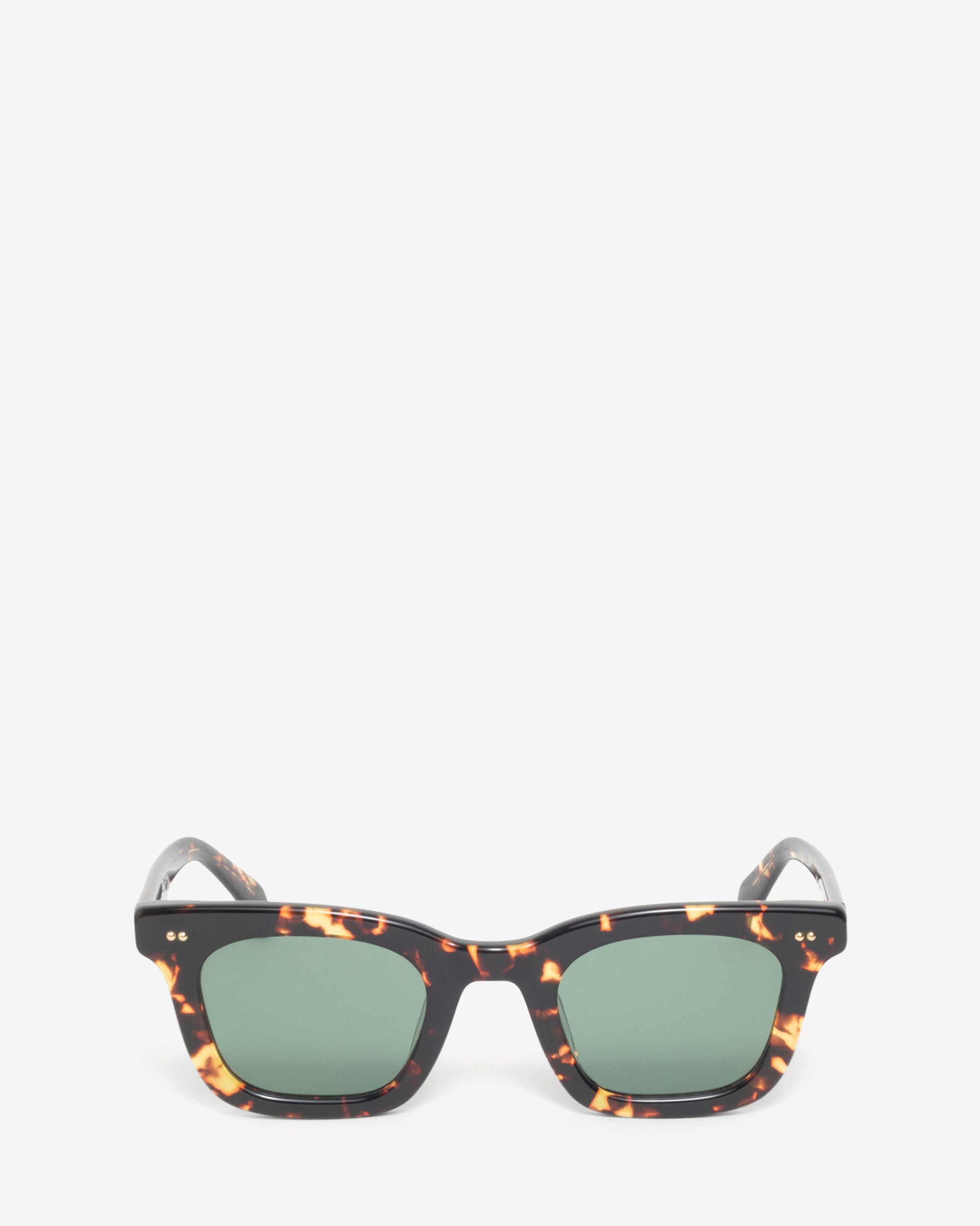 Thick square frames with a wide profile and metallic dome studs at each side. Handmade in black bio-acetate with blue tinted recycled lenses. Features laser-engraved logo detailing at the lens corner.