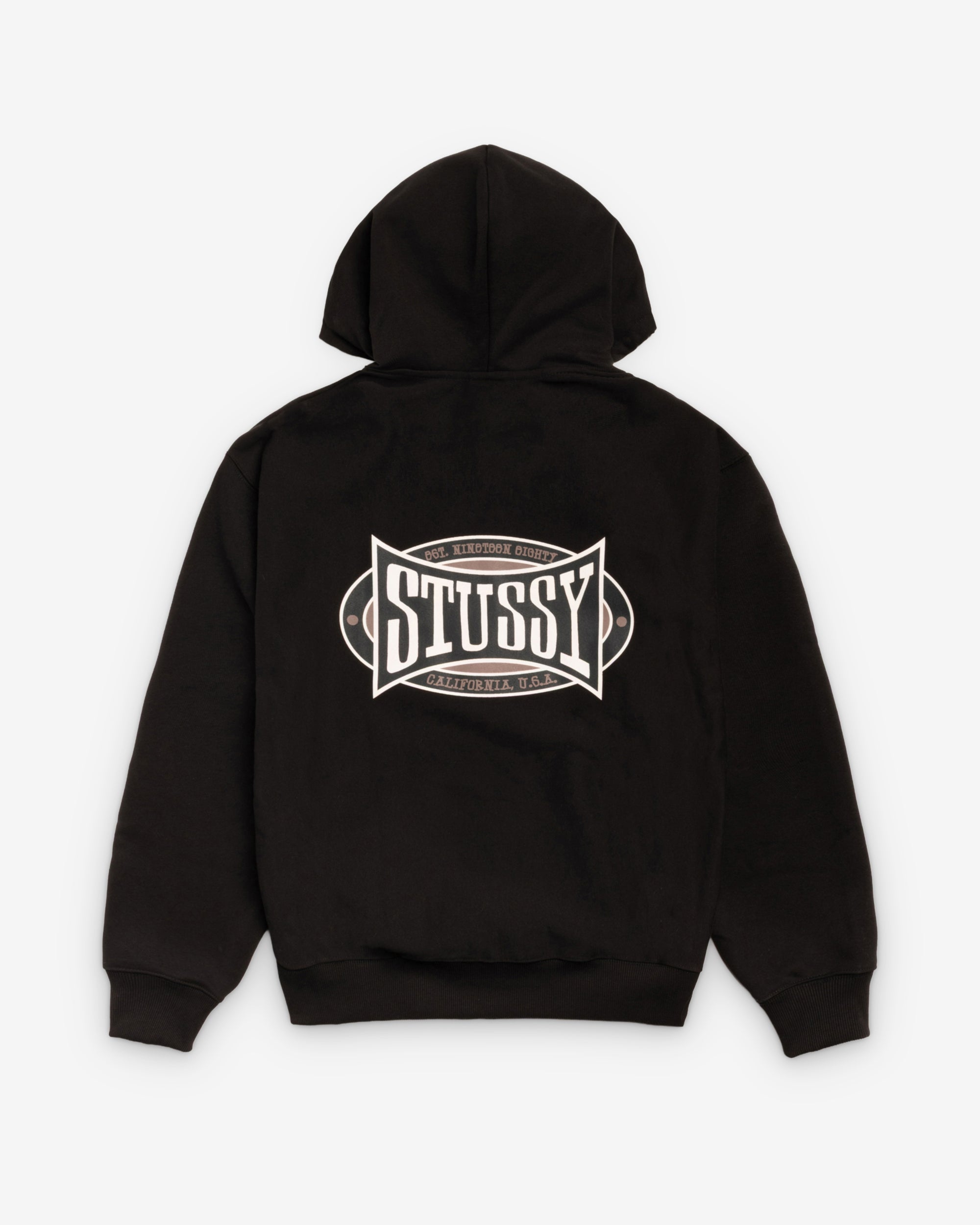 Relaxed fit zip-front hoodieHeavyweight 430gsm cotton blend fleeceRound drawcord in hoodYKK zip front closure Screenprinted graphics at front and backRibbed cuffs and hemPatch pocketsUnisexMaterial: 75% cotton / 25% polyesterImported