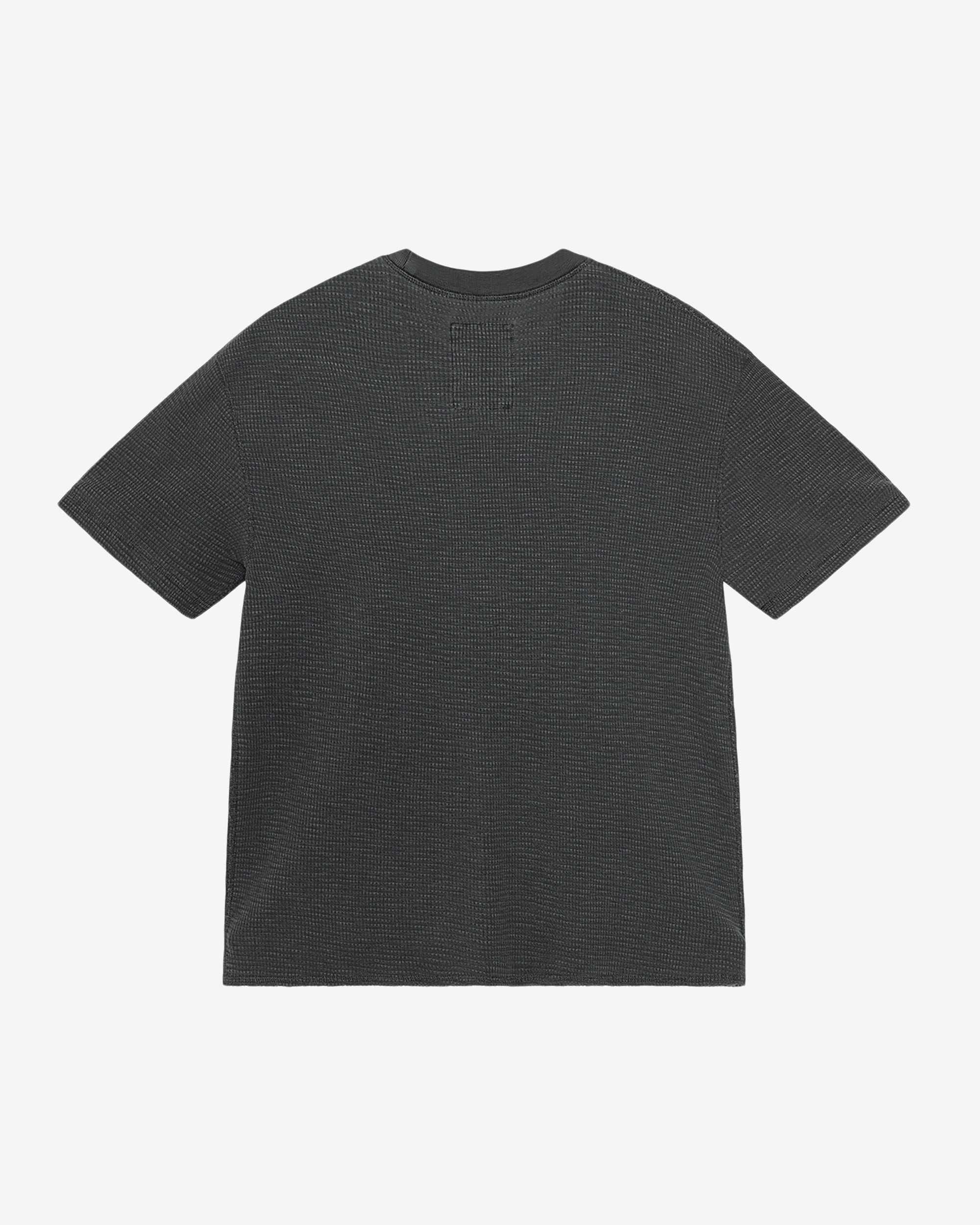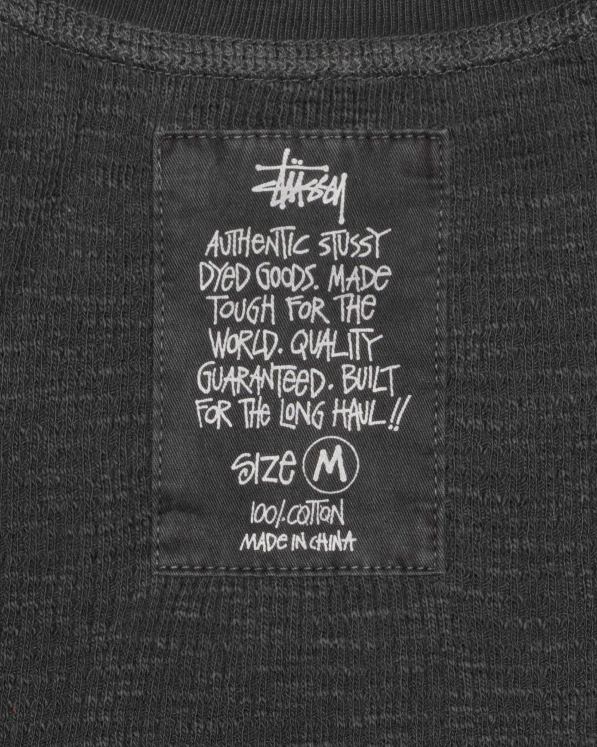 Relaxed fit waffle knit tee in lightweight, pigment dyed stonewashed cotton. Stüssy printed cotton patch label sewn at back neck.