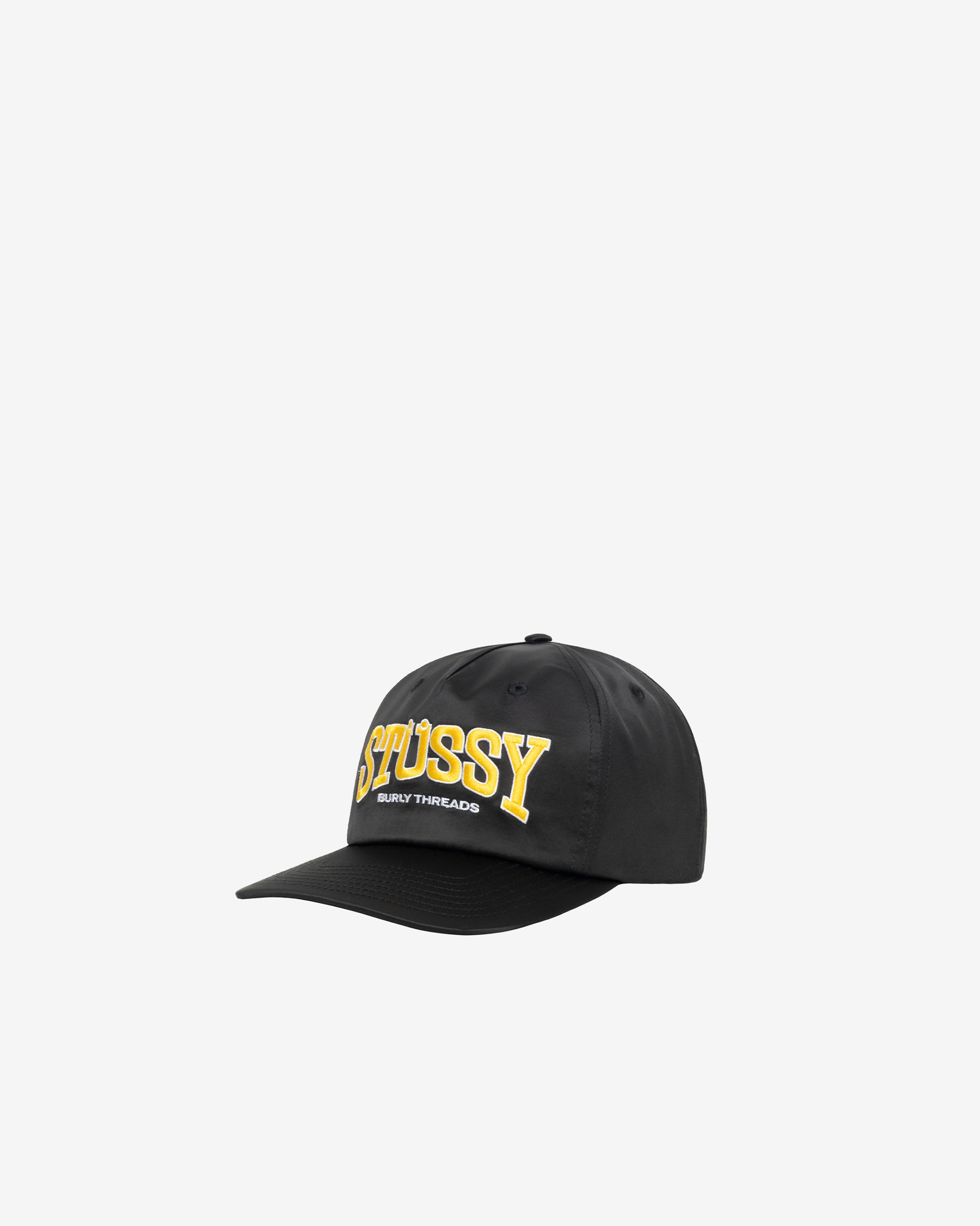 Mid-depth five panel cap with Burly Threads logo embroidery. Snapback closure Precurved brim One size Unisex Material: 97% polyester / 3% spandex Imported