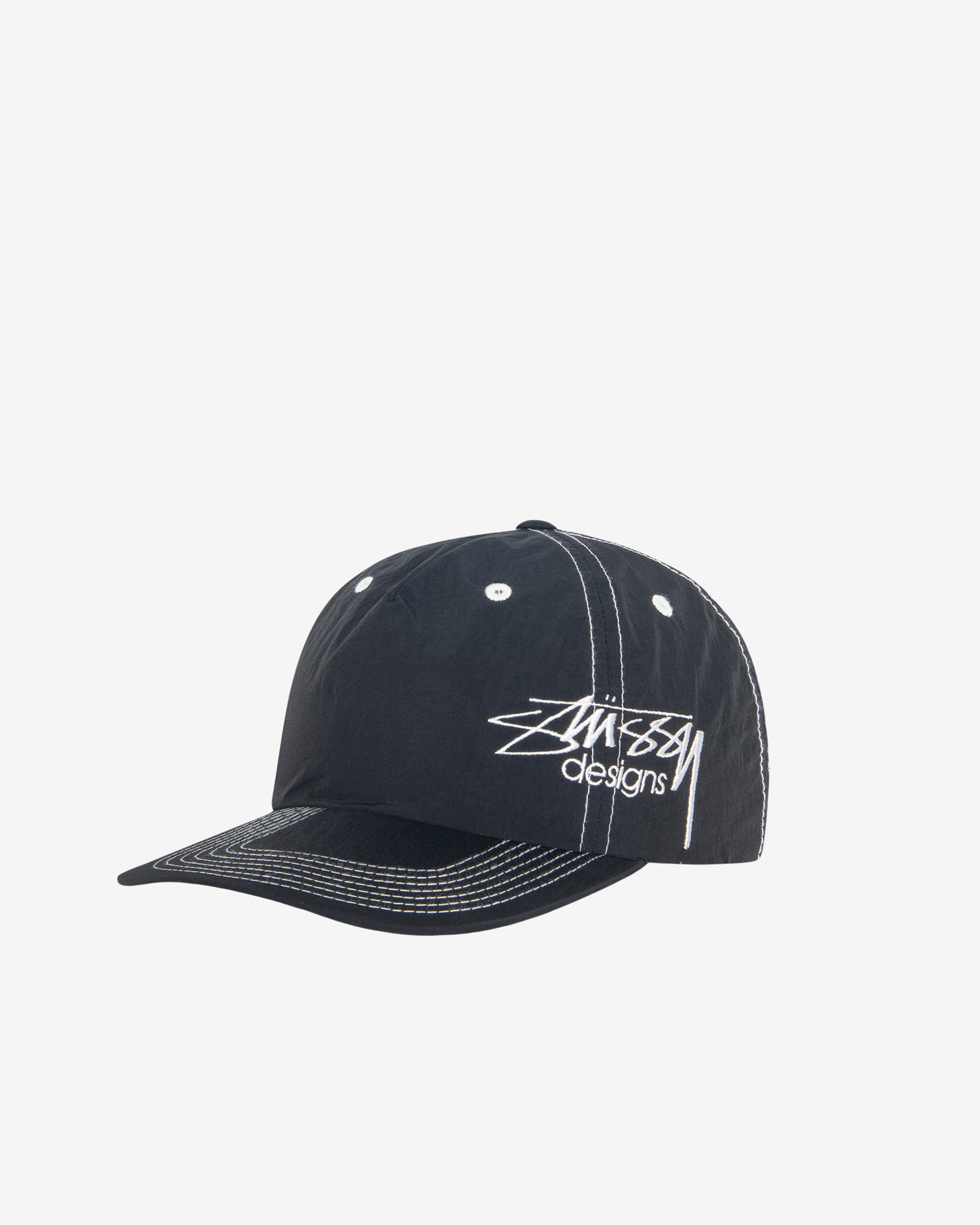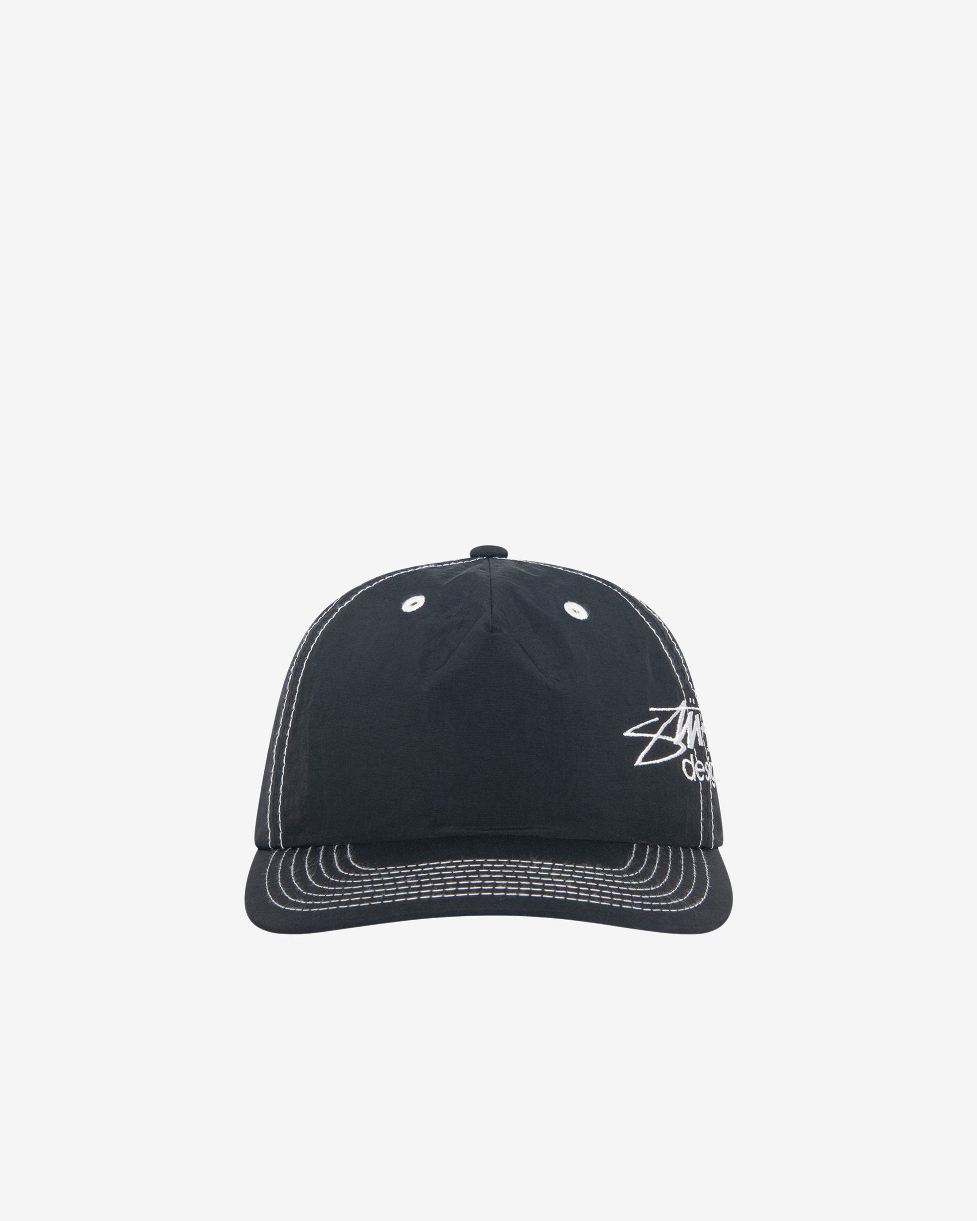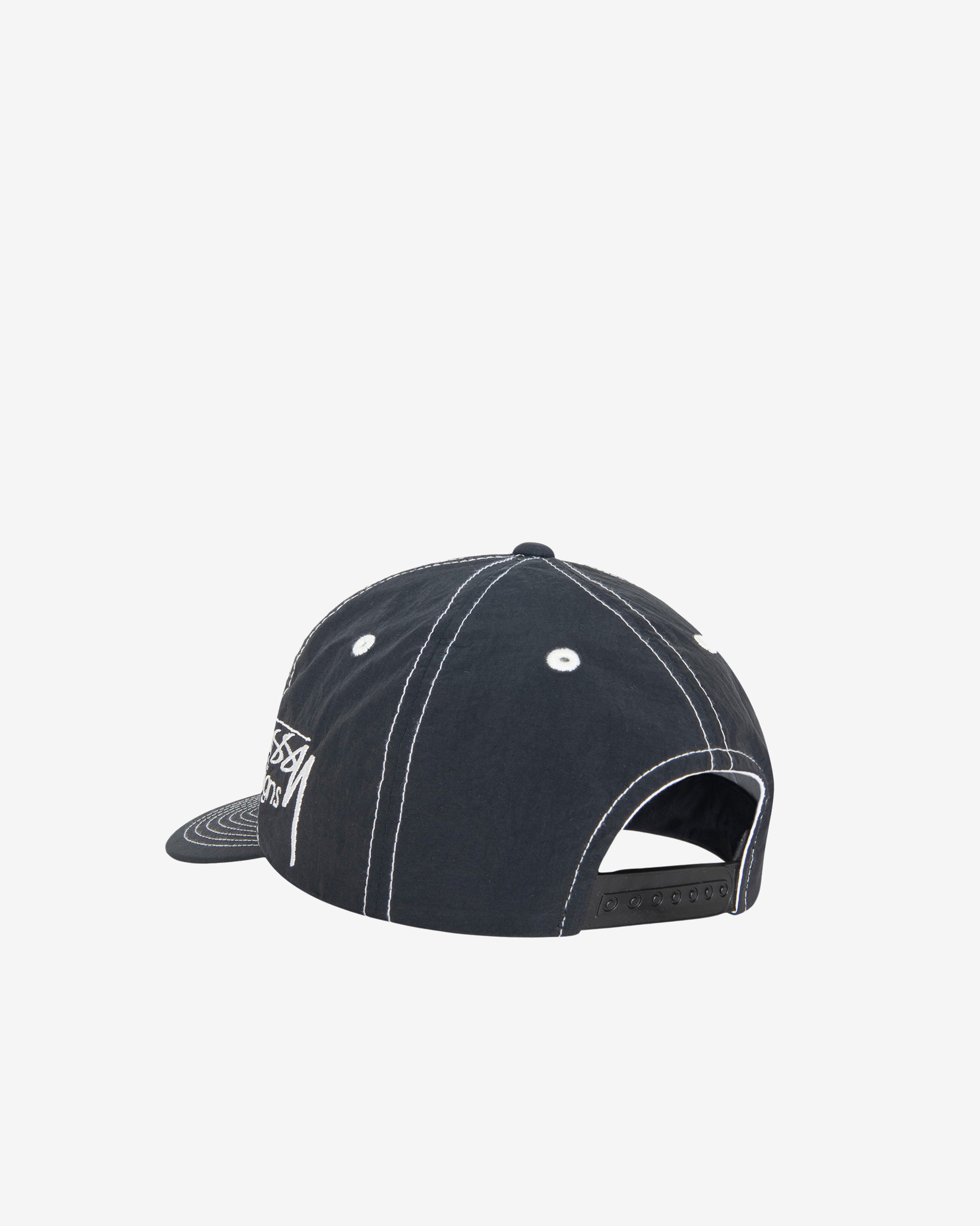 Mid-depth five panel nylon cap with contrast topstitching and woven eyelets. Stüssy designs logo embroidery at the side. Unstructured crown Pre-curved brim Snapback closure Mesh lining Cotton twill sweatband Unisex