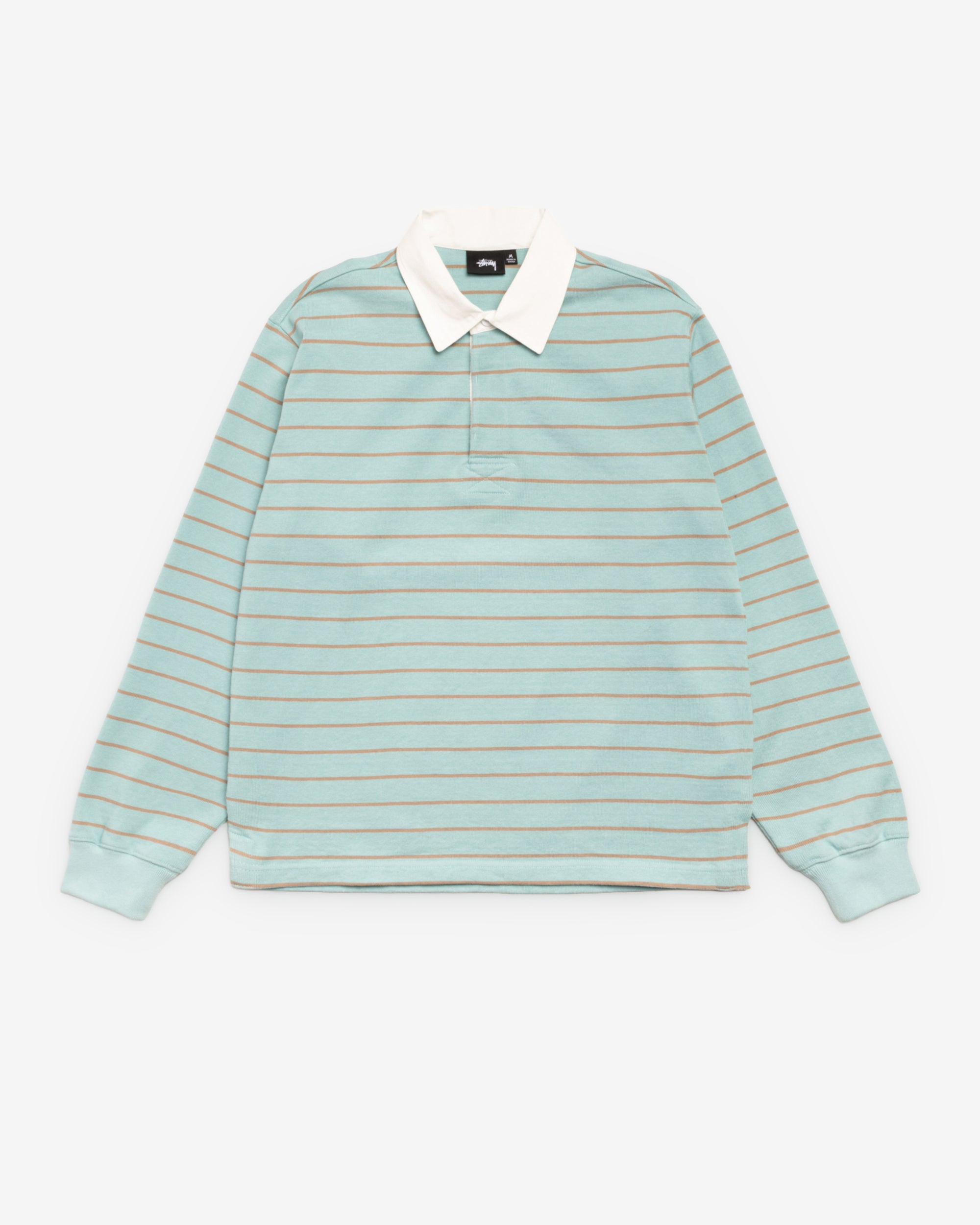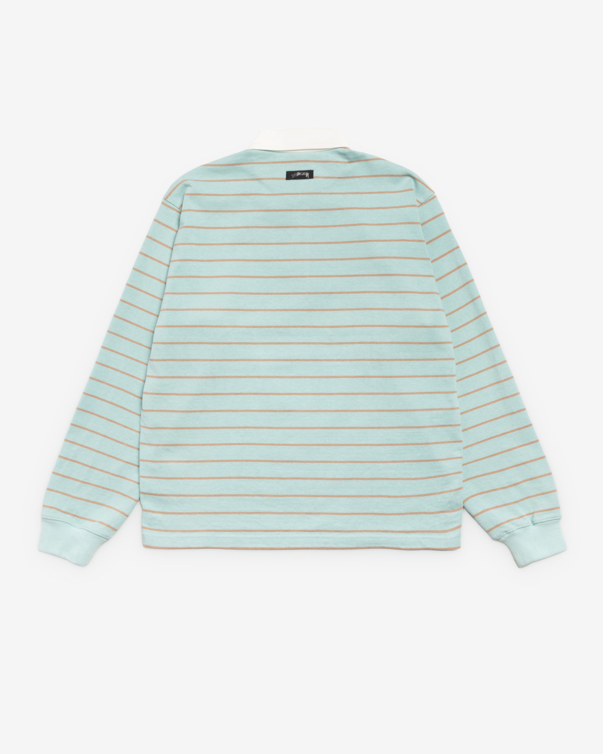 Relaxed fit rugby shirt420gsm striped cotton jerseyCotton twill collarRubber buttons with covered placketExposed button at necklineRibbed cuffsSide ventsStraight hemStüssy smooth stock label at exterior back neckMaterial: 100% cottonUnisex Imported
