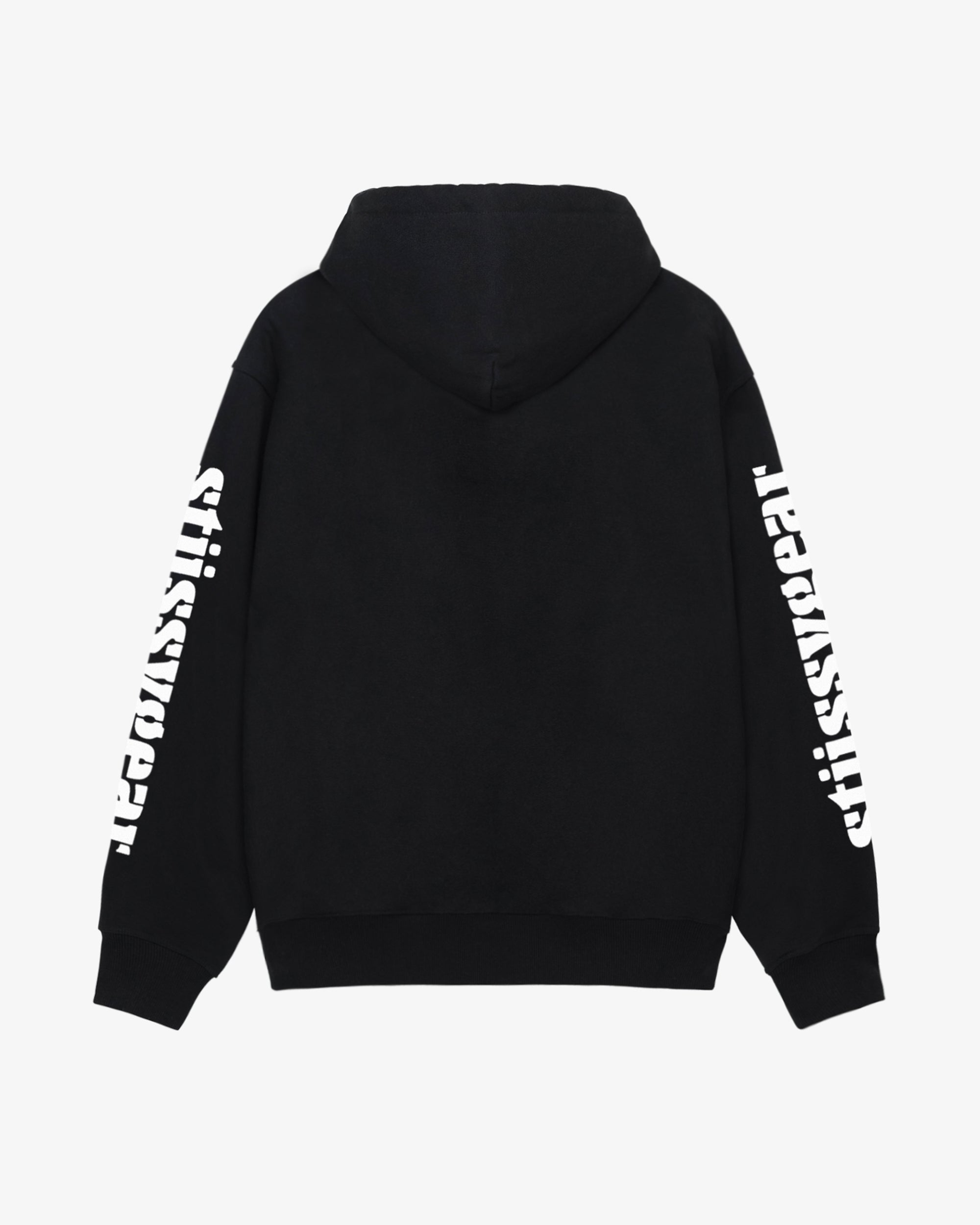 Zip-front hooded sweatshirt in a heavy 12.7oz cotton blend. Relaxed fit with screenprinted graphics. Longsleeve Round woven drawcord #5 YKK zip front closure Ribbed cuffs and hem Kangaroo pocket Relaxed fit Unisex