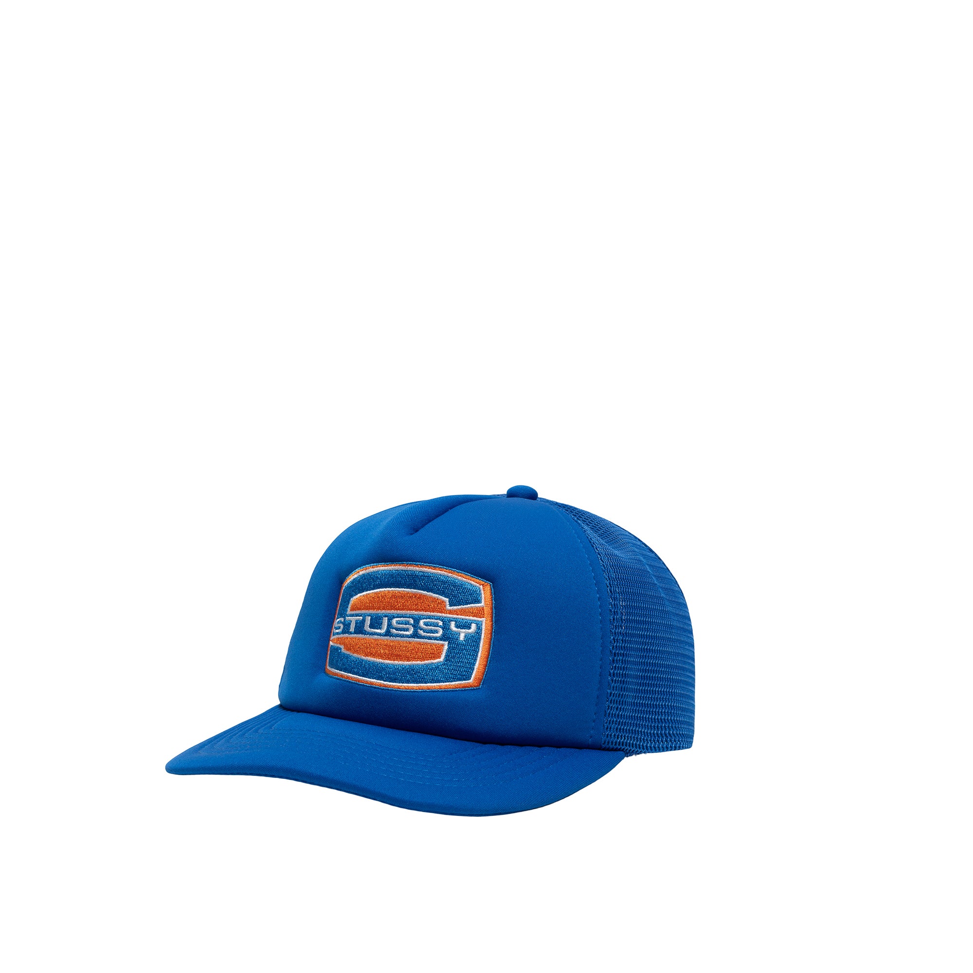 Stüssy Super 'S' logo embroideryMesh back panelsTerry cloth sweatbandSnapback closureStüssy stock flag label at back