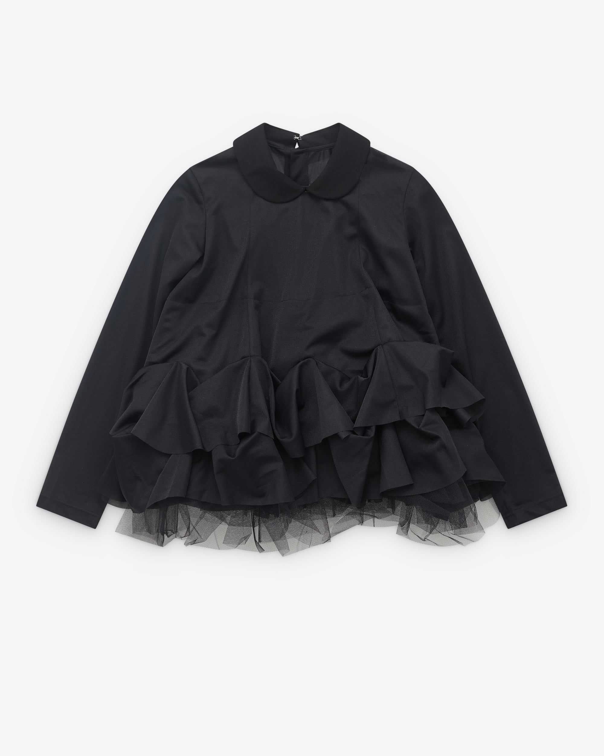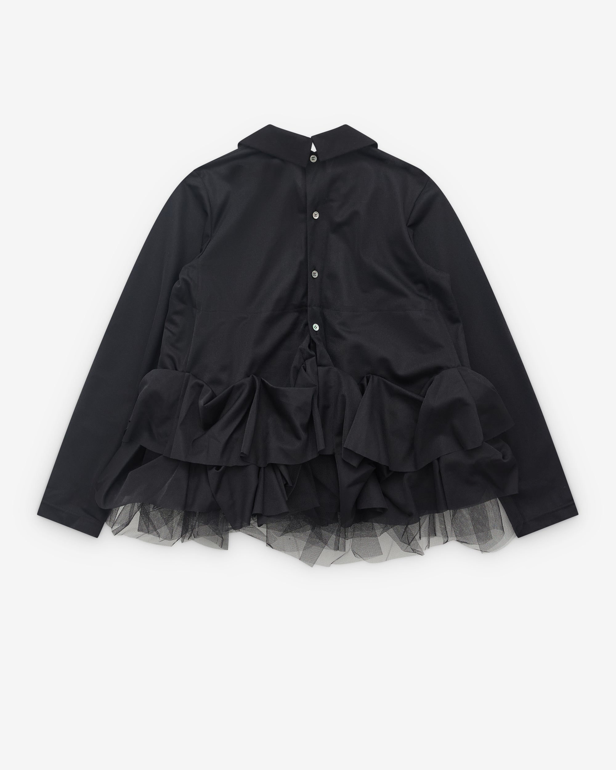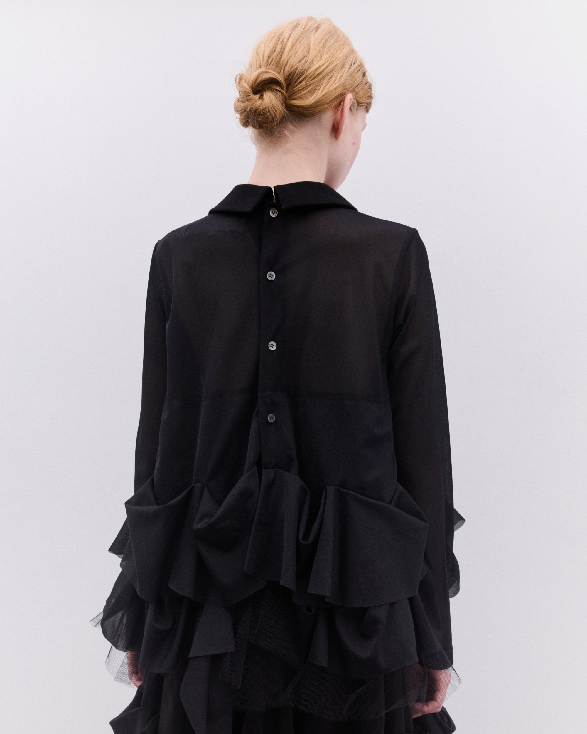 Round collarLong sleevesRear button placketSheer panellingGathered tulle peplum at hem